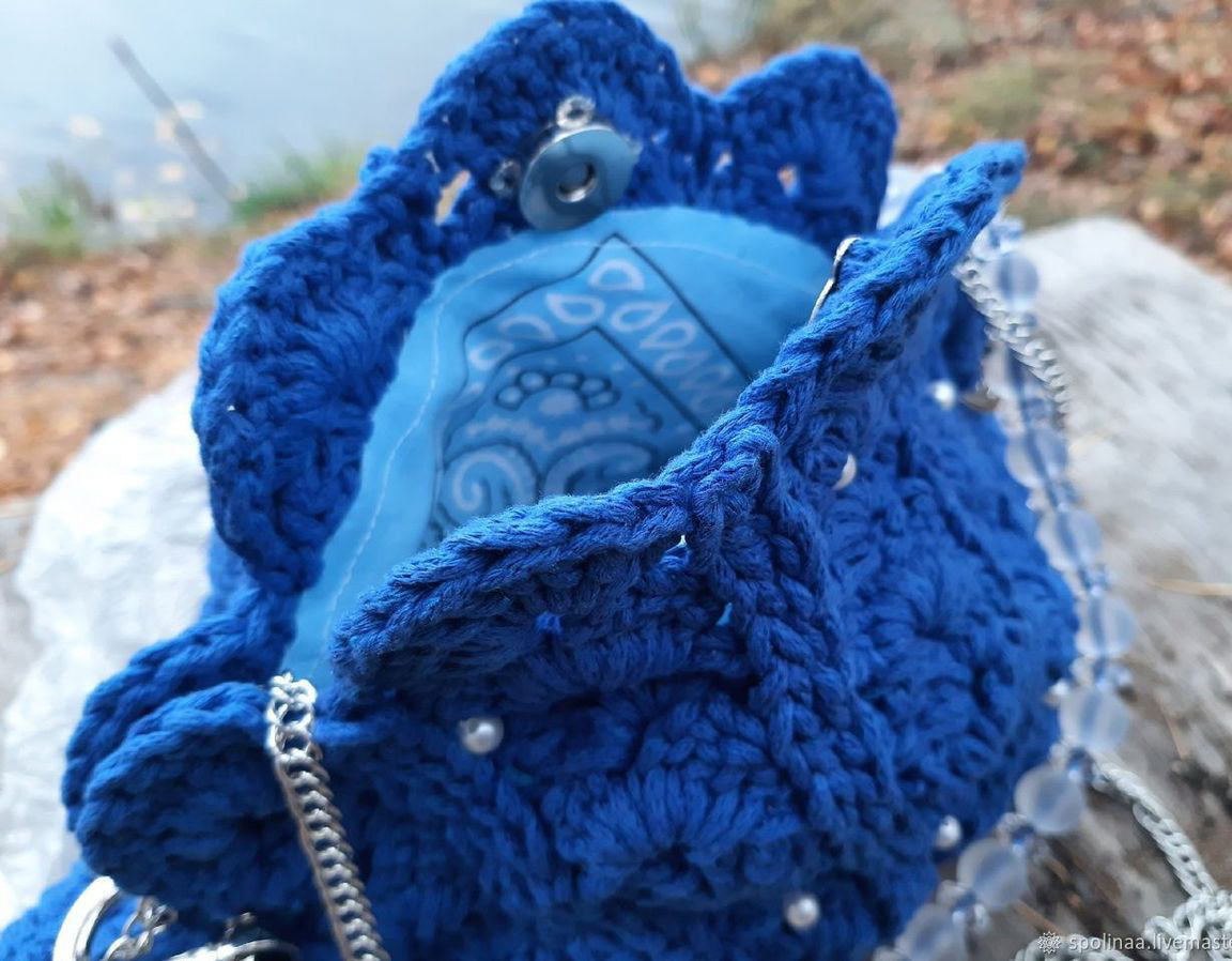 Удобная и вместительная. Выполнена из ниток макраме, украшена бусинами под жемчуг, ручка маленькая из бусин, которые удобно лежат в руке. Также сумку можно носить через плечо, т.к. в комплекте есть цепочка. Закрывается на магнитные застежки. Внутри прошита тканью.