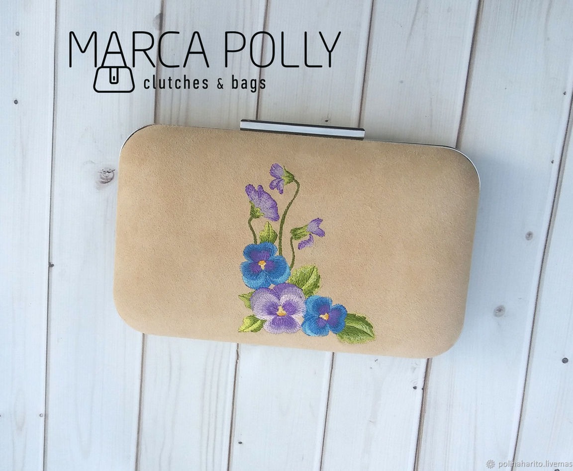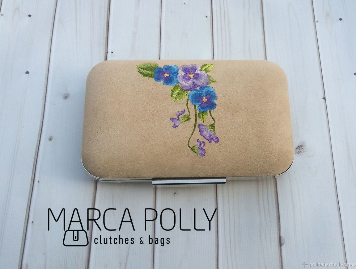 Предлагаю Вашему вниманию невероятно красивый клатч с вышивкой. Рисунок выполнен на натуральной итальянской замше молочного оттенка. Веточка виолы выполнена в фиолетовых, синих и сиреневых оттенках. Такой клатч дополнит Ваш образ и внесет изюминку. Сейчас актуальны яркие элементы, к которым относится и вышивка.