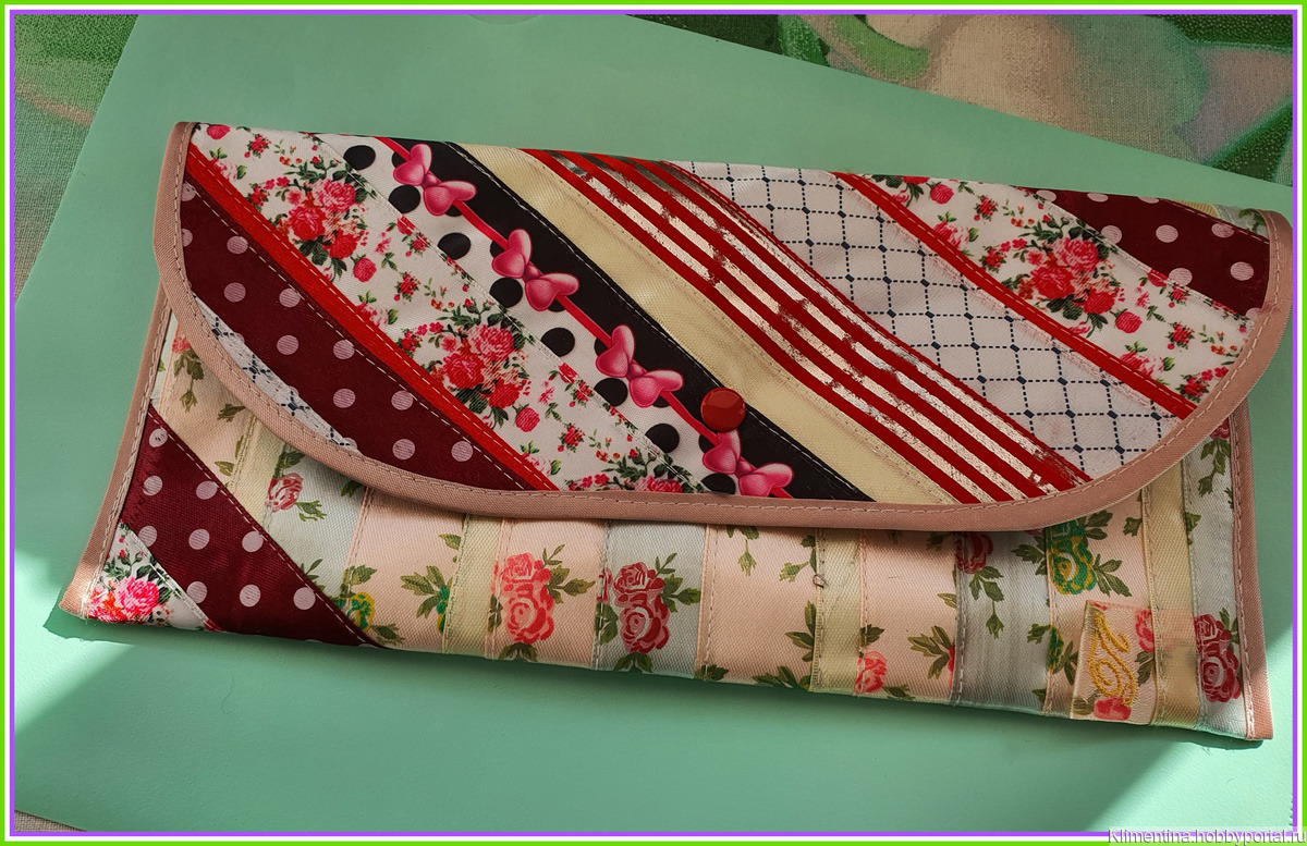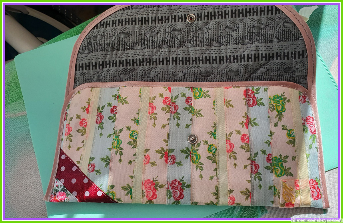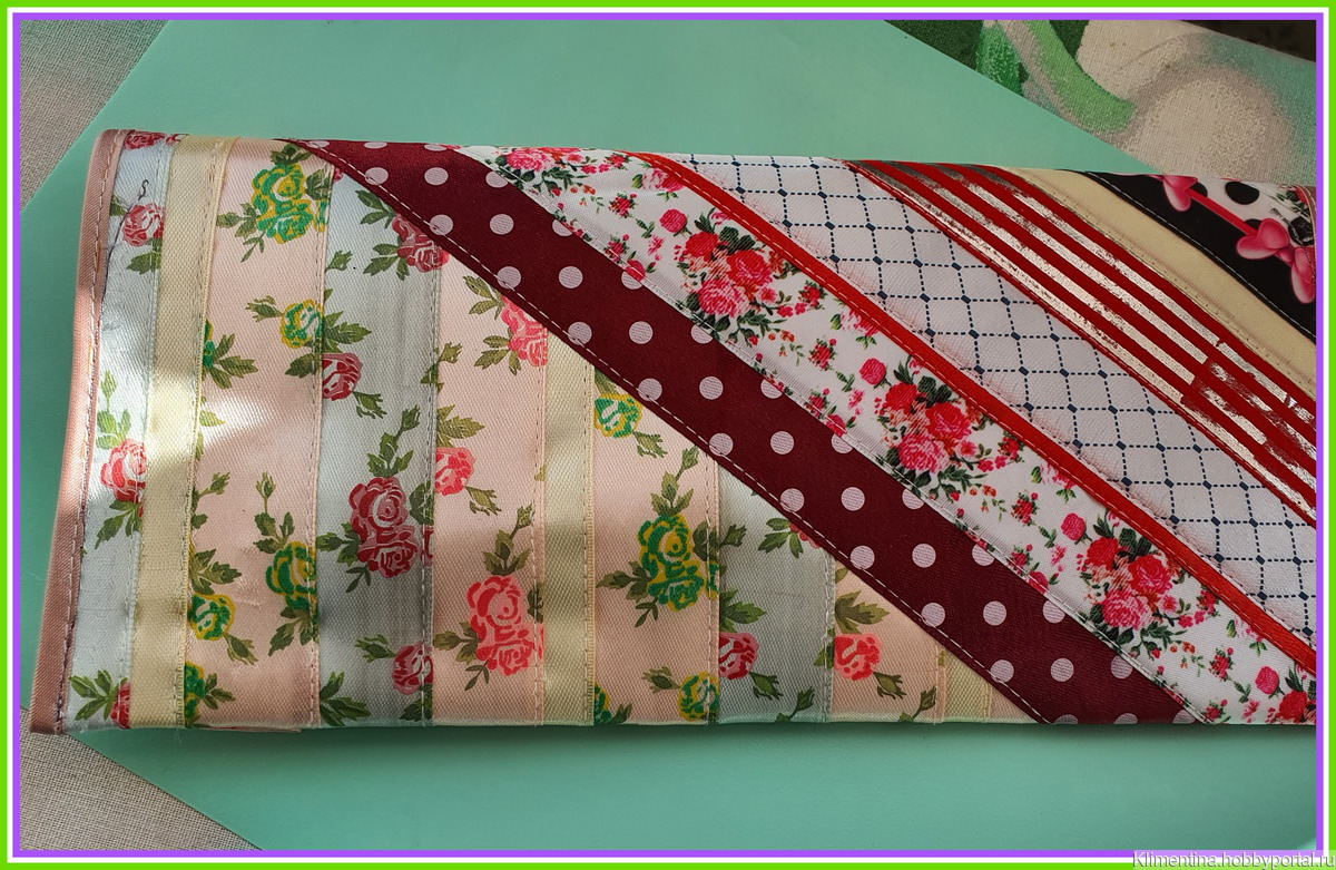 Выполнено в стиле "лоскутного шитья" из атласных лент, на синтепоне, внутри натуральная ткань,закрывается на кнопку. Цветовую гамму можно выбрать по желанию.