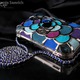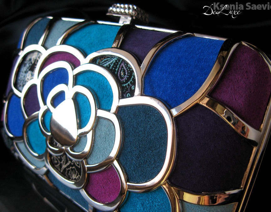 Эксклюзивная сумочка ручной работы, выполненная в технике мозаики из натуральной кожи и замши. Узор в виде цветка в сине-бирюзовой гамме с лиловыми вкраплениями. В цепочку продет замшевый шнурок. Застежка украшена стразами. В цепочку продет шнур в тон клатча, что служит как декоративным элементом, так и усилением прочности. Цепочка может быть отстегнута или убрана внутрь клатча.
