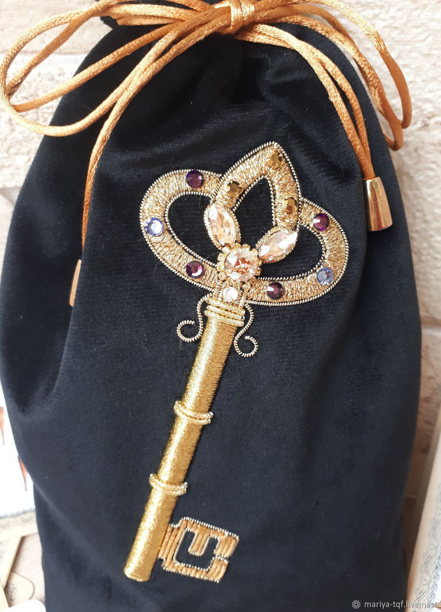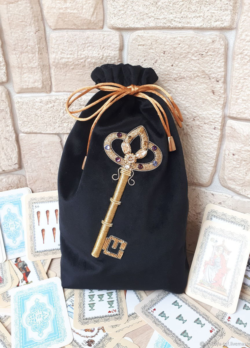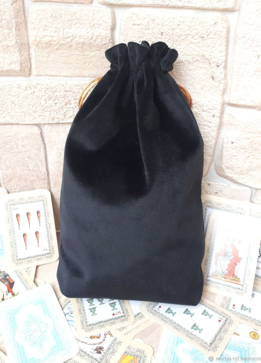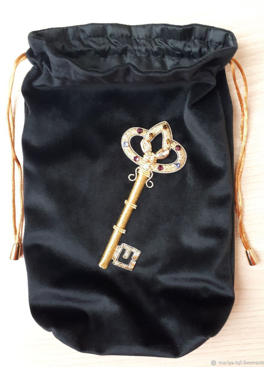 Мешочек для Таро, Рун или для хранения ваших сокровищ). Мешочек выполнен из бархата, черного цвета. Бархат нежный, шелковистый, пыль не собирает, прост в уходе. Внутри черная подкладка из жаккарда, атласные завязки. Вышивка выполнена в ручную в стиле золотого шитья, из высококачественных материалов Японских, Чешских и Австрийских производителей. Мешочек имеет удобный размер 25*19 см.