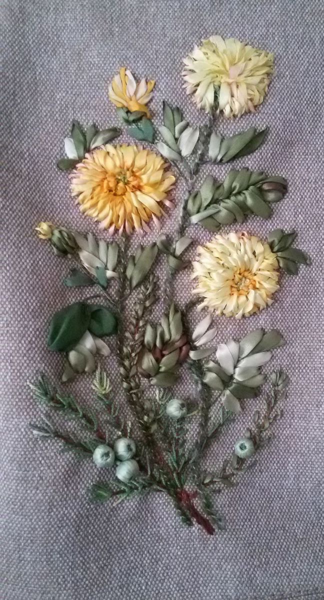Ягоды можжевельника вышиты в технике объемной вышивки, т.е. каждая ягодка изготовлена отдельно, а затем вышита на сумке. Сумка смотрится элегантно.