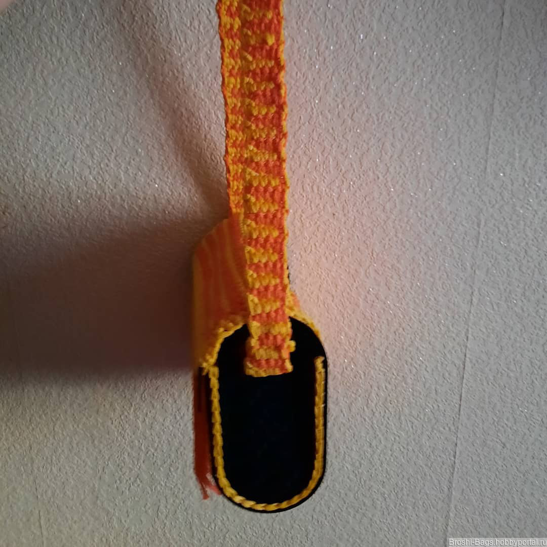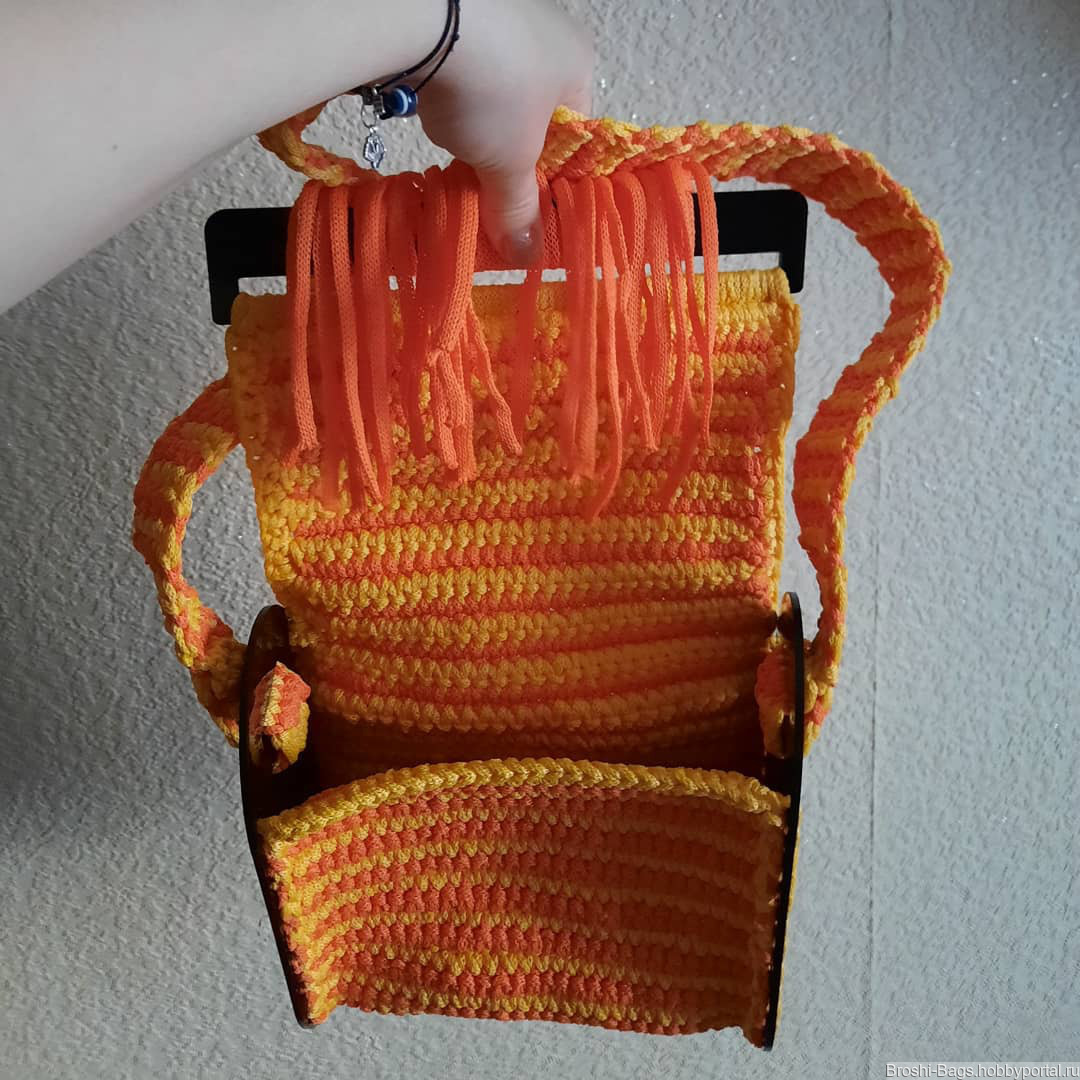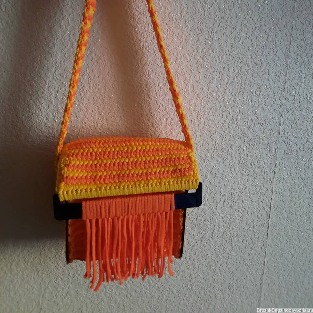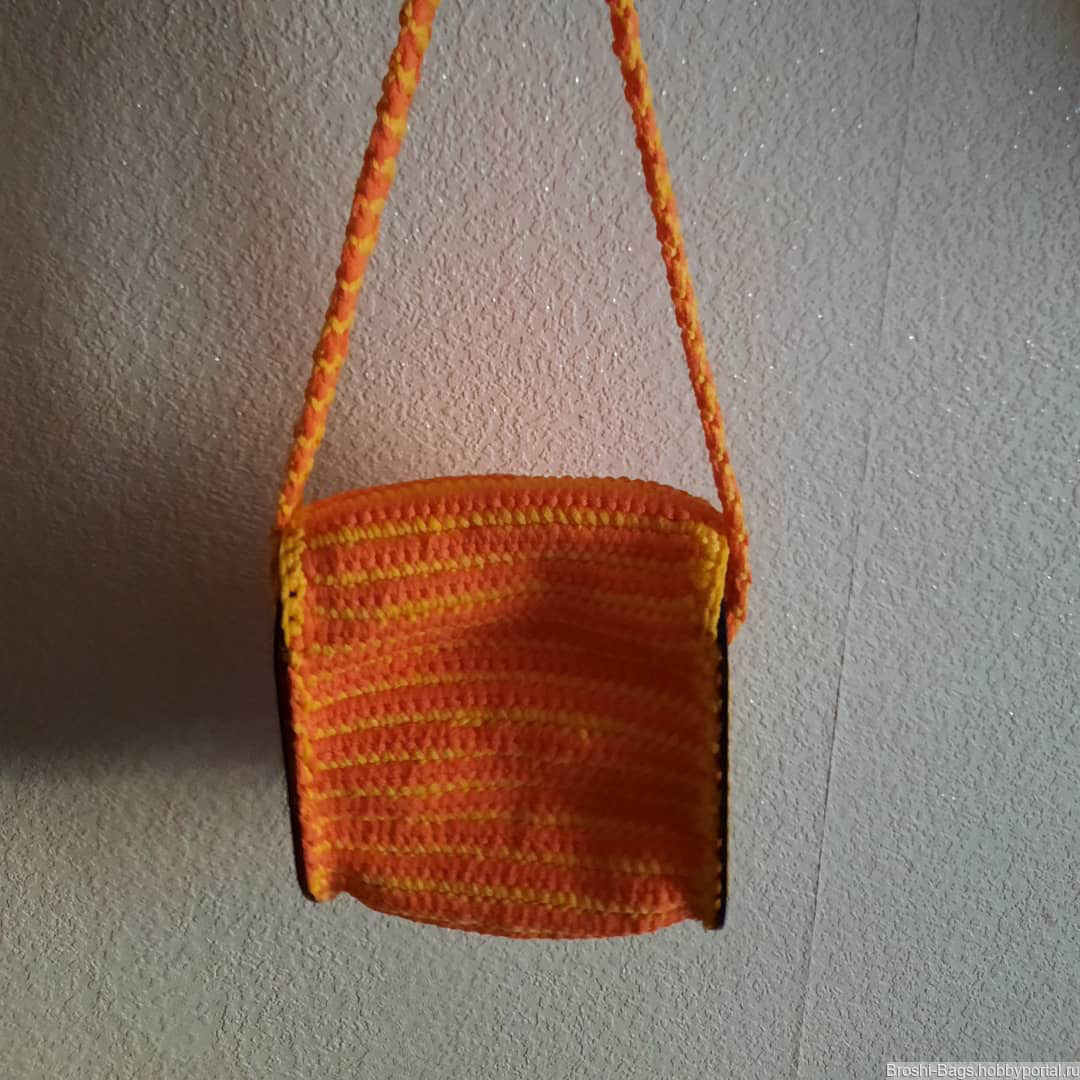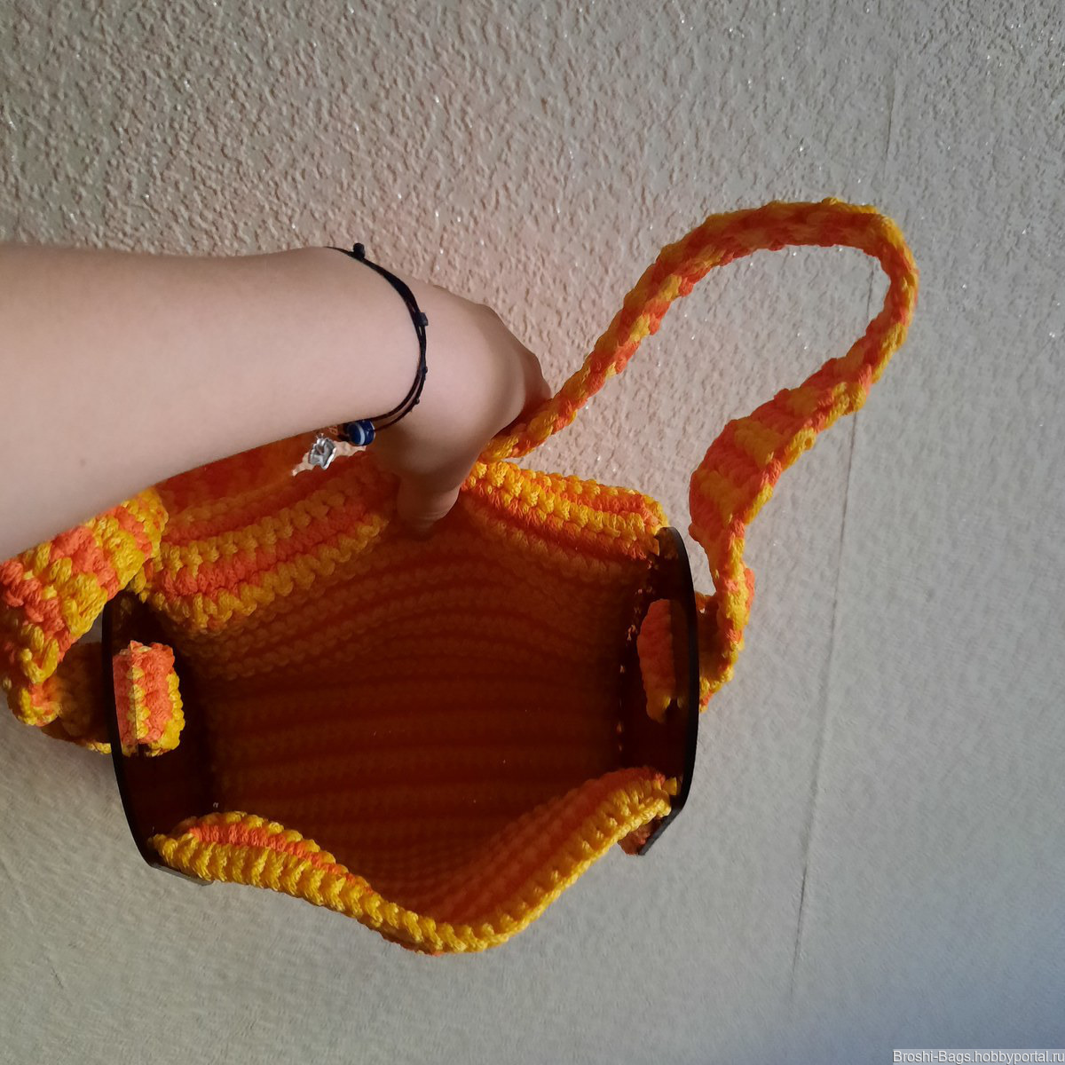 Сумка связана крючком из пряжи двух цветов. Боковины и клапан выполнены из поликорбоната черного цвета.