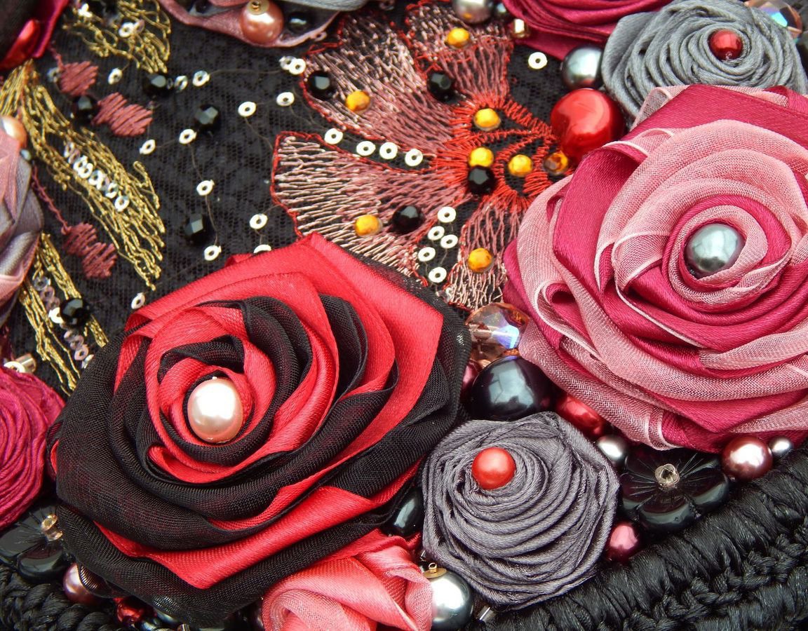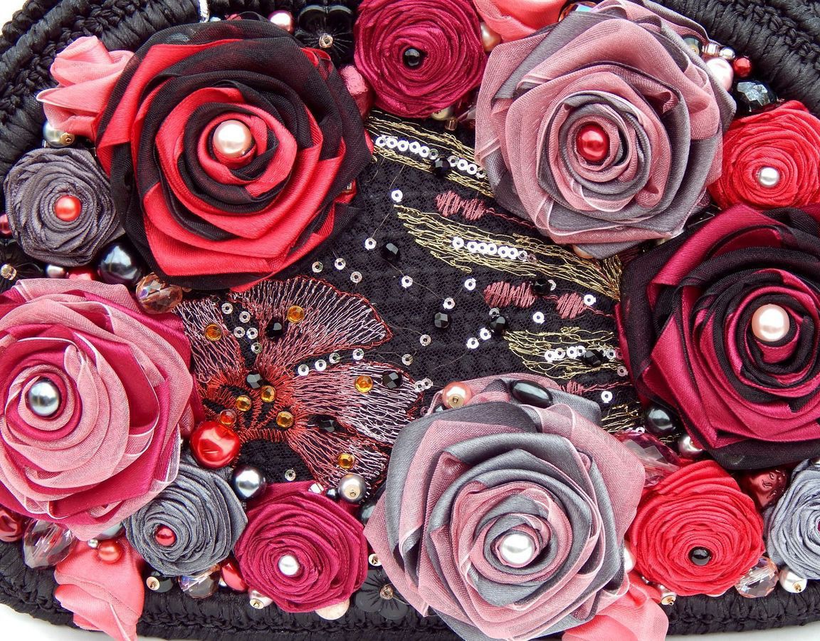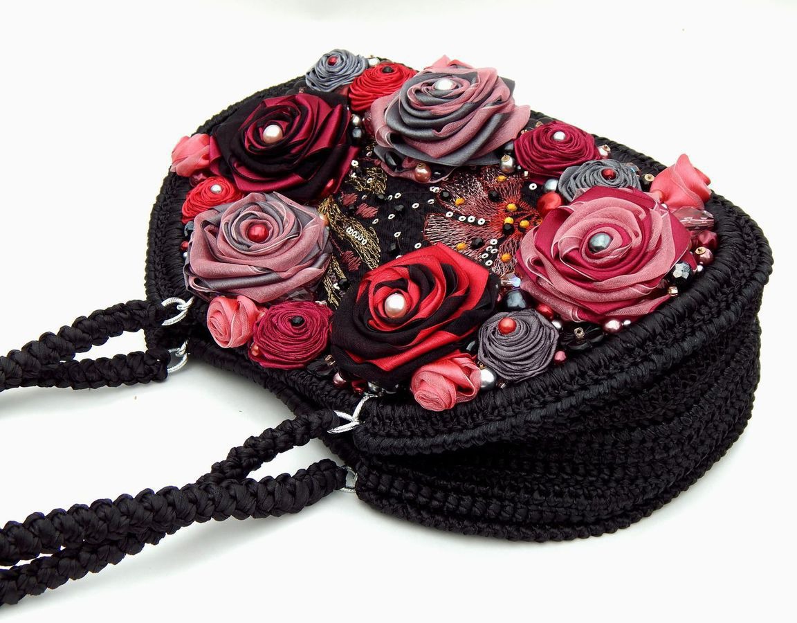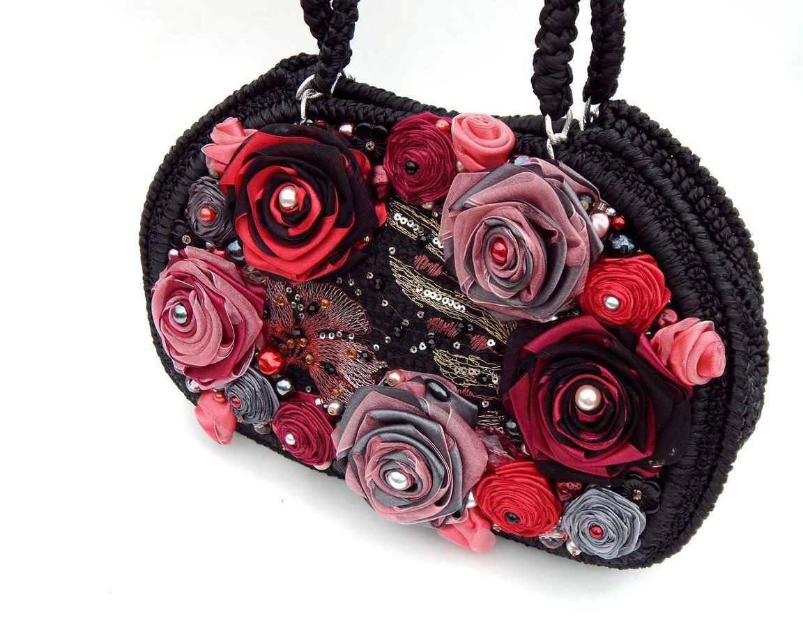 Сумочка связана крючком из атласных лент. Декорирована розами из атласных лент и лентами из органзы, чешскими бусинами под жемчуг, бусинами из стекла, кружевным полотном, итальянскими пайетками и бисером Тохо.