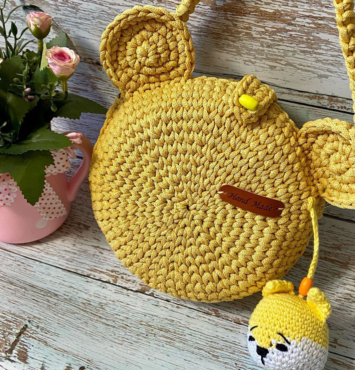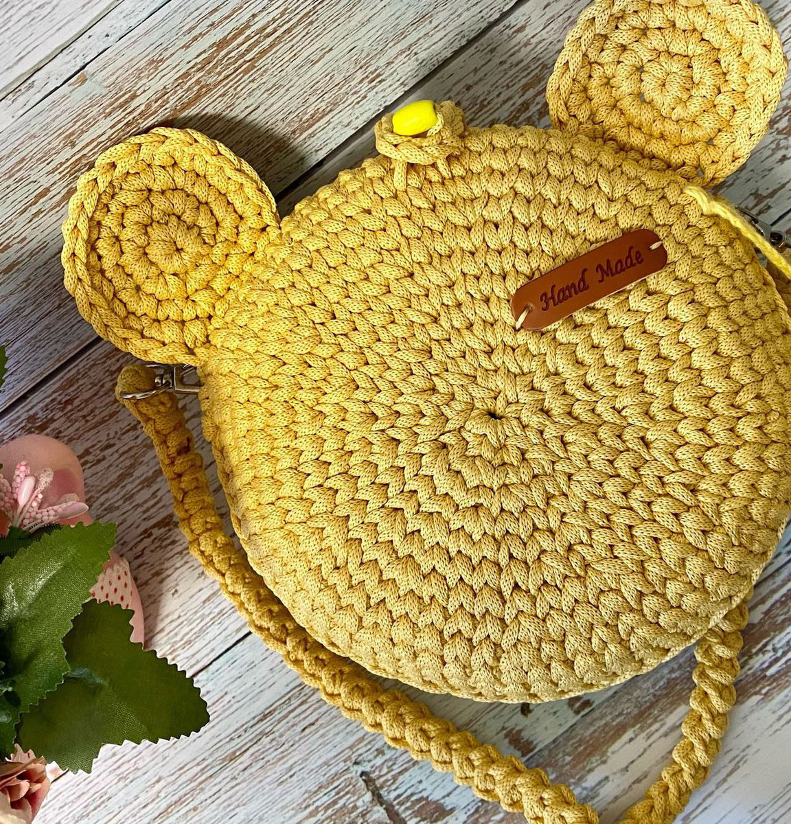 Сумка детская,связана из полиэфирного шнура. Сумочка-мышка имеет длинный ремешок. Застёгивается на пуговку. Сумочка диаметром 16 см.