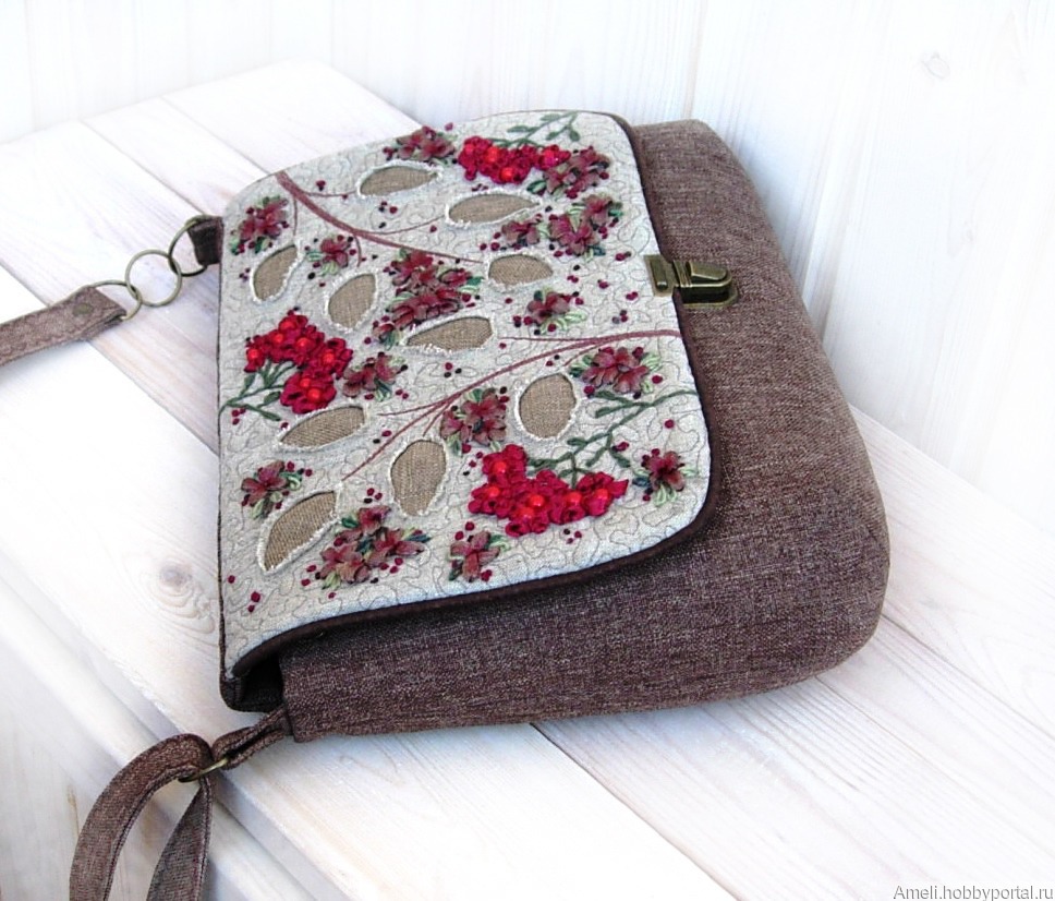 сделана также по настроению и вдохновению)) Вставка на клапане -натуральный лен природного цвета, на котором вышиты травы и цветы хлопковыми нитками и атласными лентами, прошиты методом прорезной аппликации листья с бахромой).
