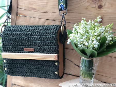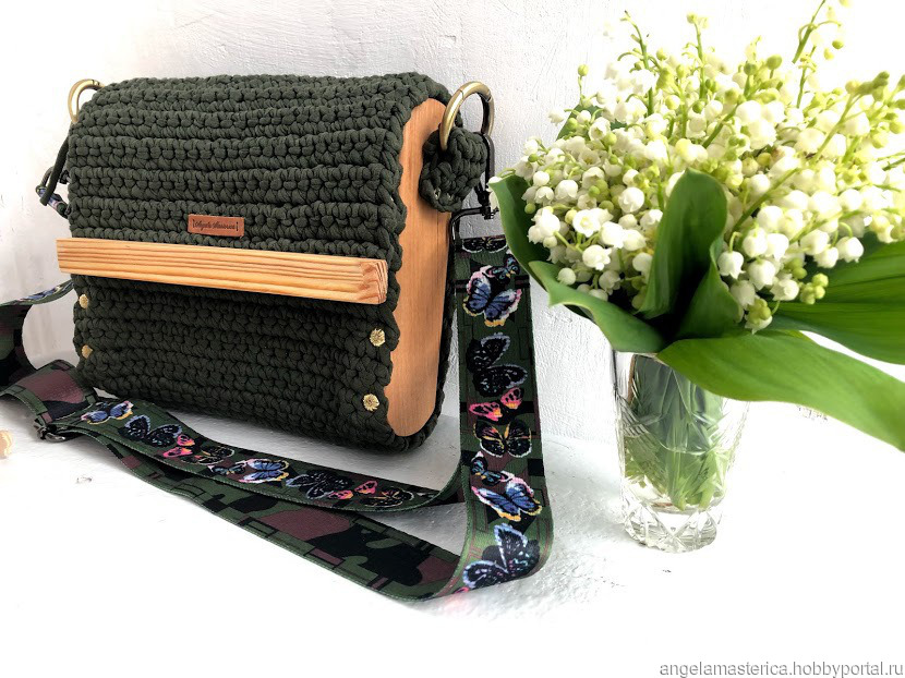 Сумка из деревянных элементов- массив ольхи,и вязаного уплотненного полотна цвета хаки.Съемный плечевой ремень с регулировкой длины цвет хаки с бабочками.Логотип из натуральной кожи.Внутри подклад и внутренний карман.