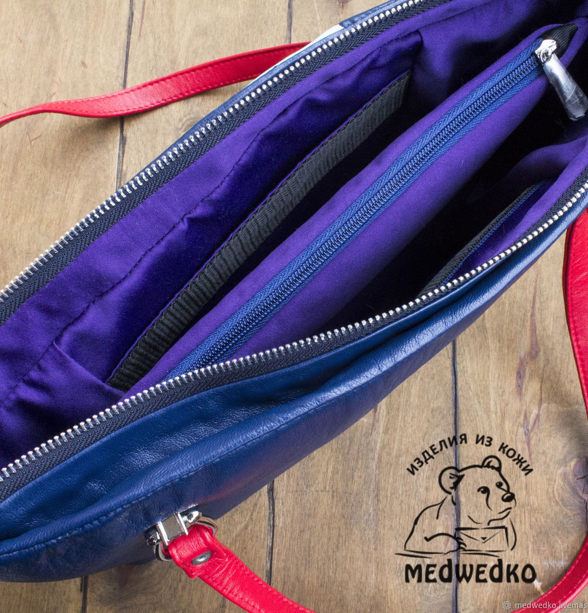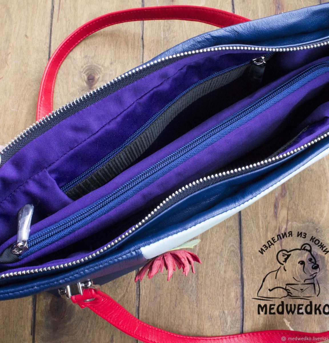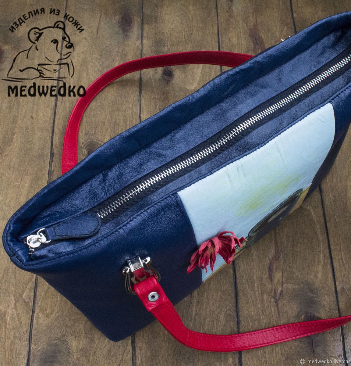 На передней стенке сумки аппликация из кожи и роспись акриловыми красками. Сверху покрыто матовым акриловым лаком.