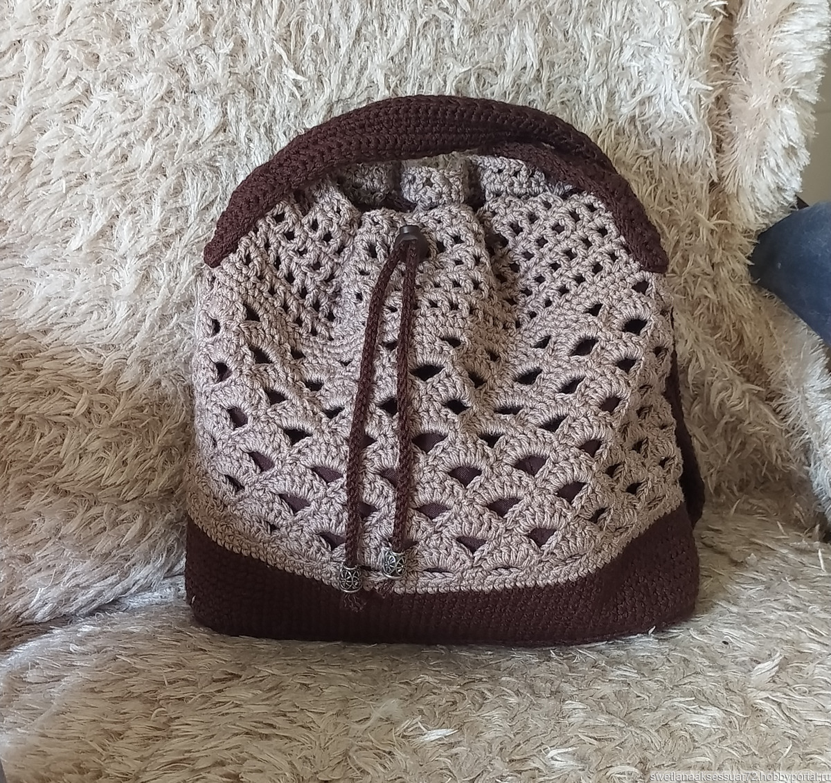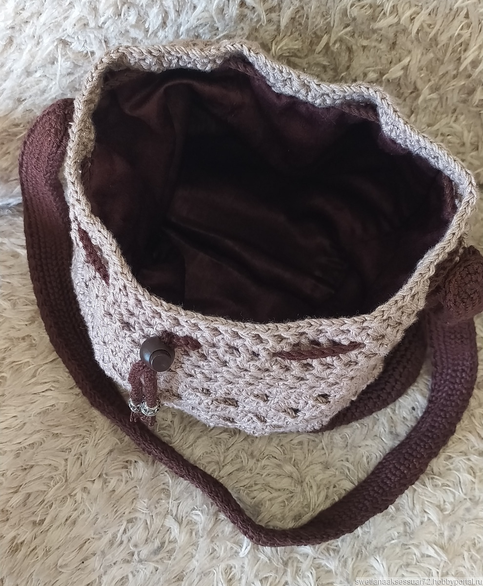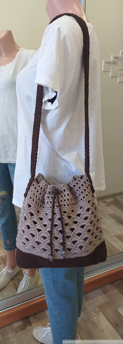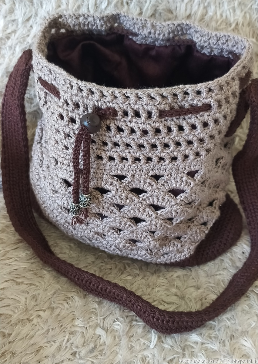 Сумка - кисет изготовлена из пряжи акрил микрофибра крючком. Размеры: высота - 27 см, ширина - 32 см, глубина -6 см, высота ручки - 45 см.