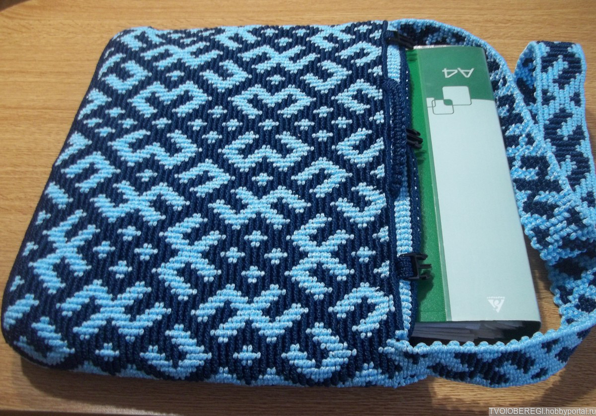 Сумка задумывалась мной как деловая - для бумаг (помещается формат А4), тетрадей и т.п. Она же может служить для переноски ноутбука, и тогда мной, для защиты от ударов, под подкладку подшивается вспененный полипропилен. Застёгивается сумка на молнию и фиксируется фастексами для надёжности. Имеется подкладка из водонепроницаемой плащевой ткани.