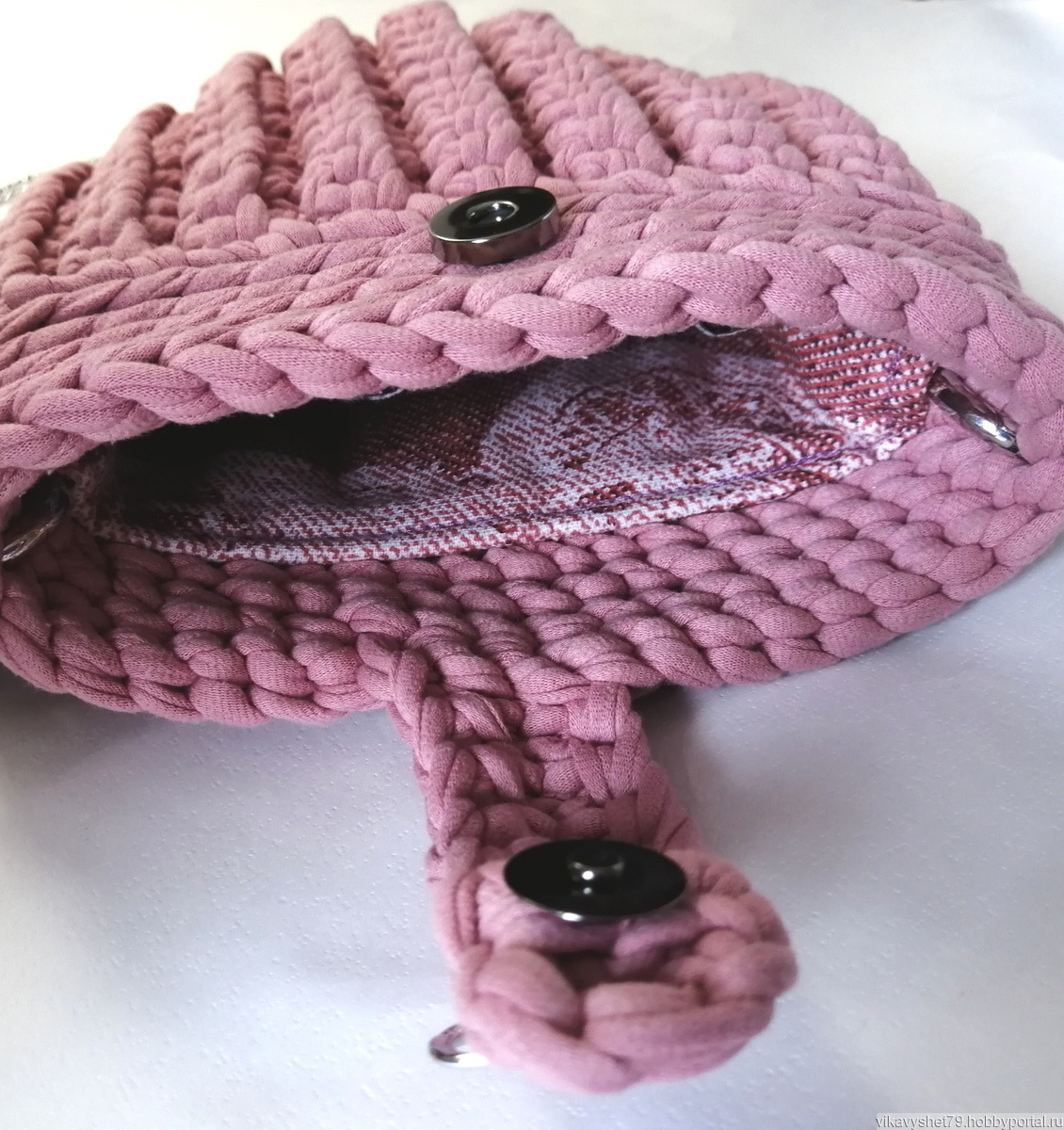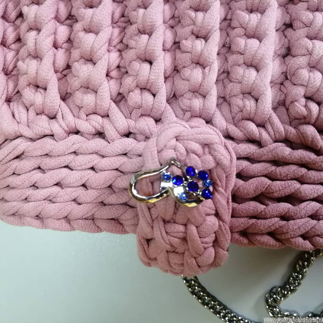 Сумка-ракушка связана из трикотажной пряжи. Цвет пыльная роза. Размер 21*20. Подклад с небольшим карманом.
