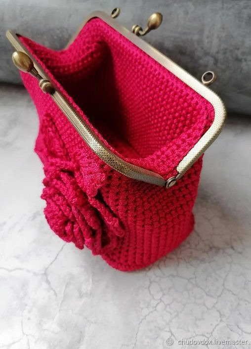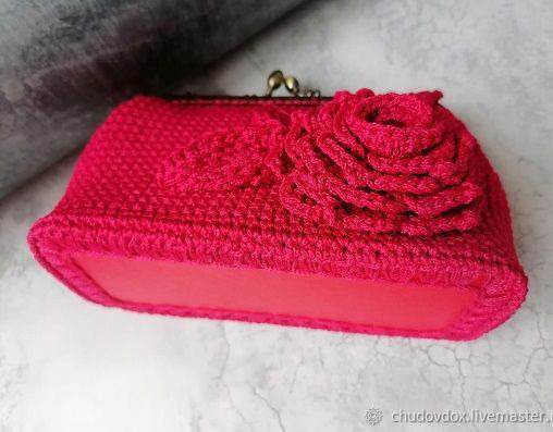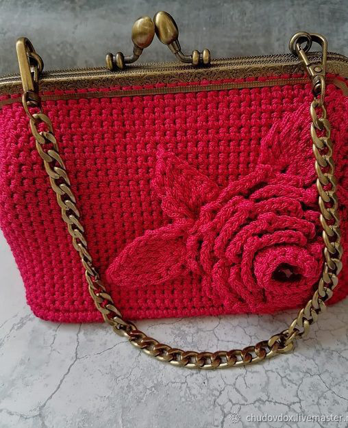 Сумка выполнена из шнура макраме 2мм. Цвет - красный. Фермуар и цепочка - цвет бронза. Цветок из этого же шнура макраме. В середине цветка чешская бусина (стекло). Донышко - экокожа.