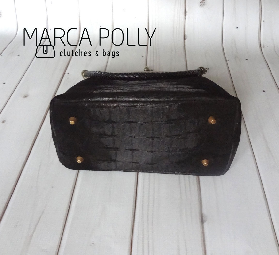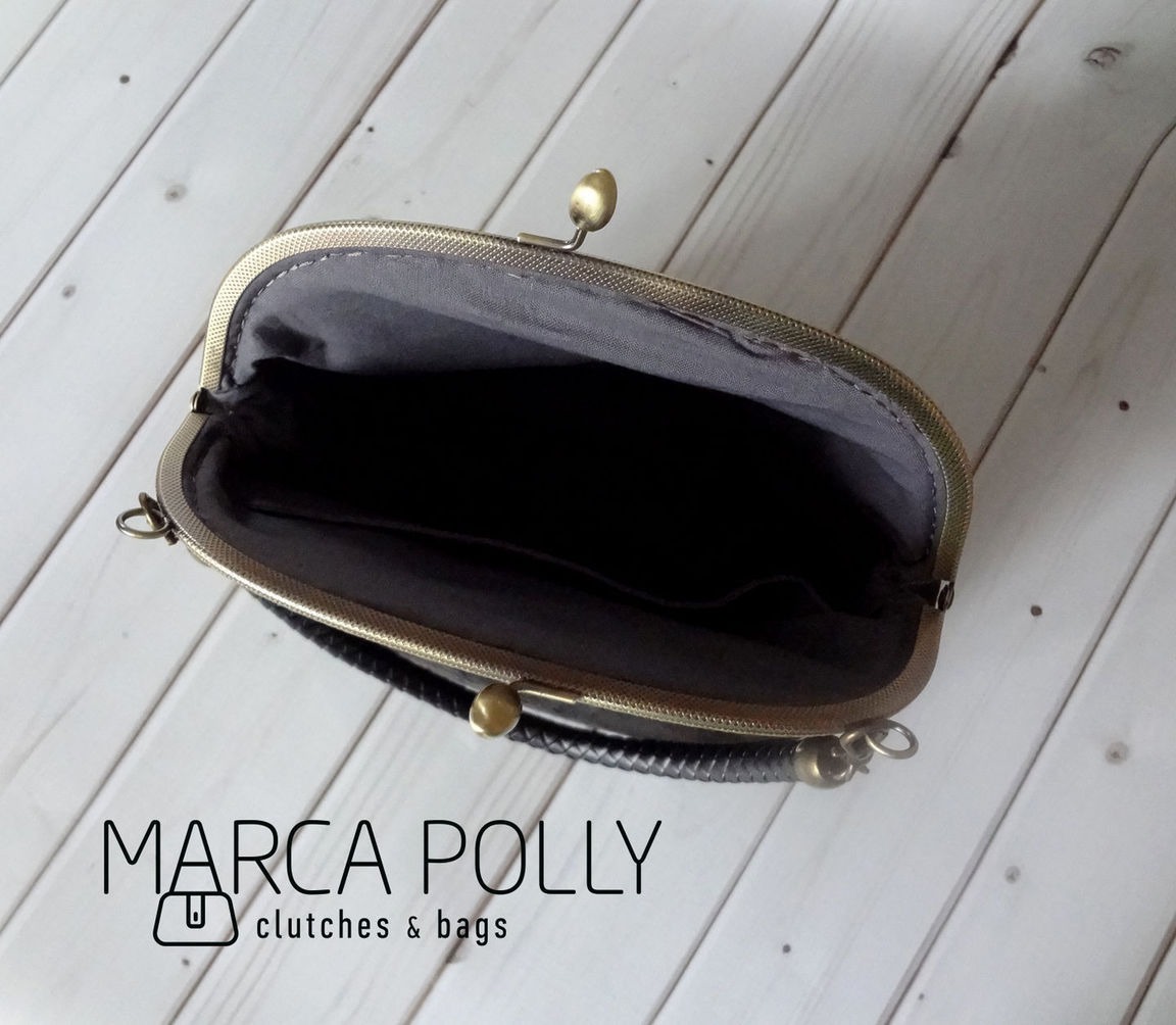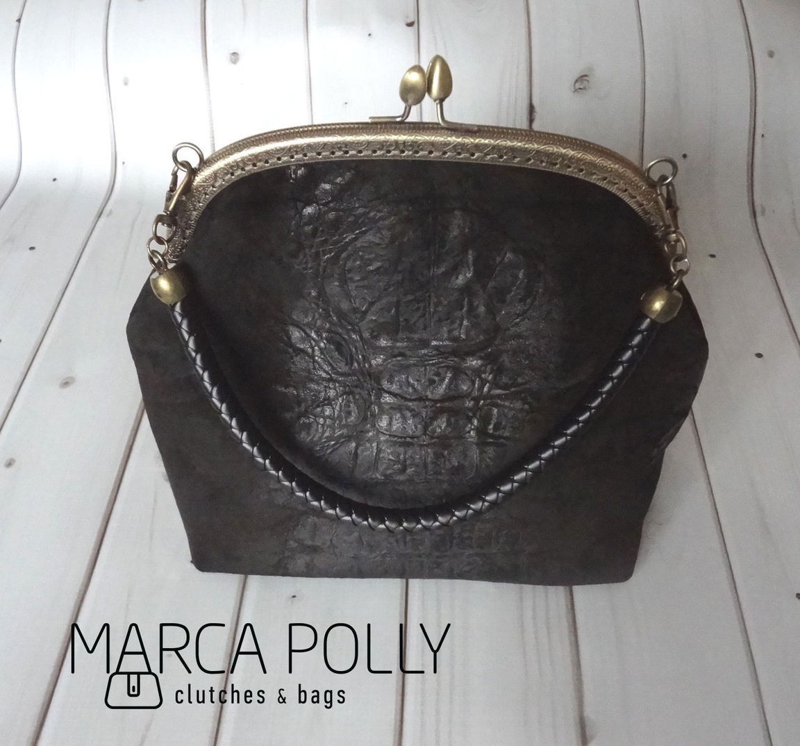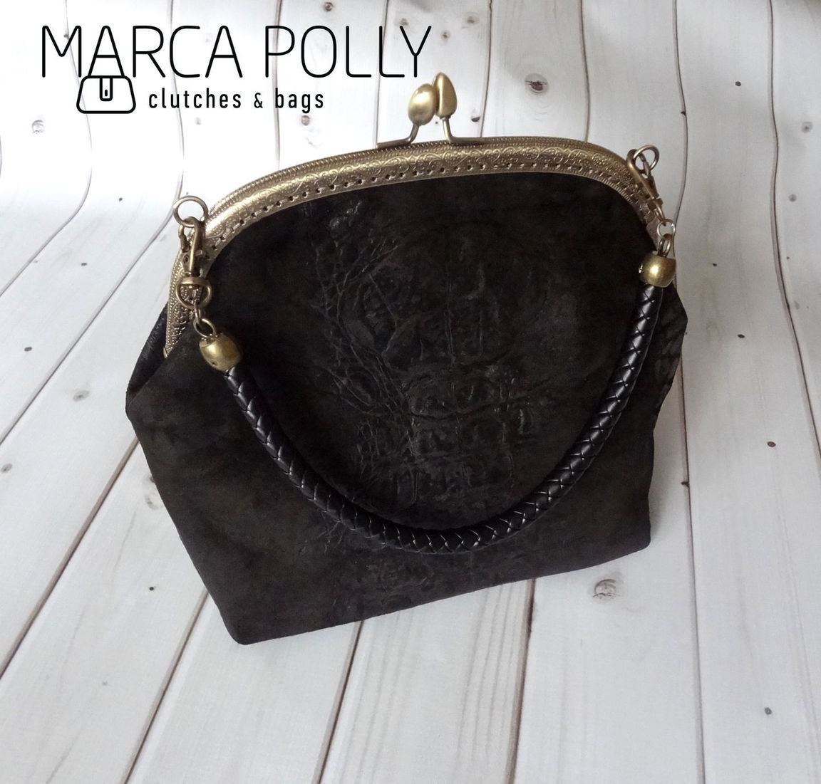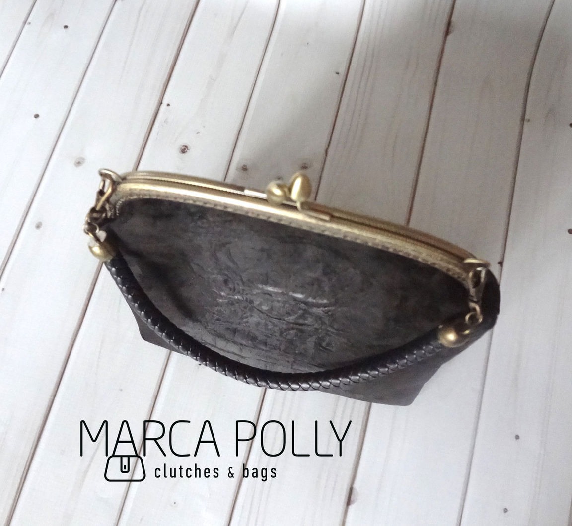 Сумка с фермуаром ручной работы. Выполнена из натуральной итальянской замши черного цвета с тиснением под рептилию (крокодил). Сумка пришита к винтажному фермуару цвета латунь. Внутри подкладочка из американского хлопка серого оттенка. Внутри кармашек для мелочей.