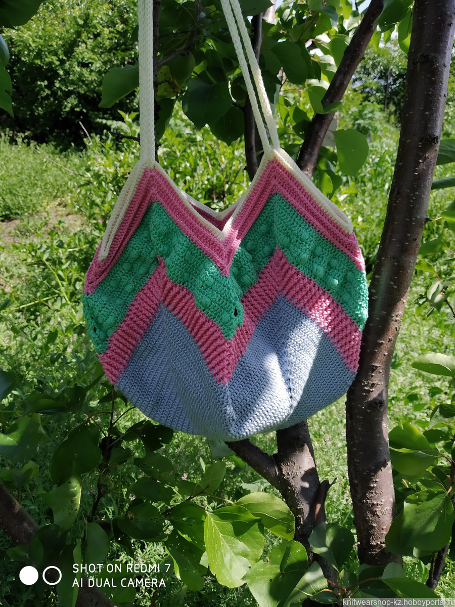 Сумка выполнена крючком из мерсеризованного хлопка. Подойдёт для прогулок, походов по магазинам, на пляж. При перемешивании ручек, становится рюкзаком. Очень вместительная. Ширина дна 25*25см. Высота сумки 30см.
