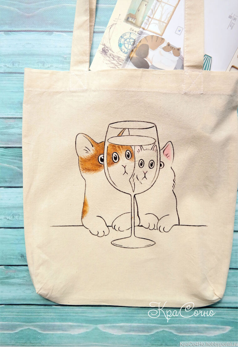 Рисунок на сумке выполнен вручную специальными красками по ткани и закреплен термически.