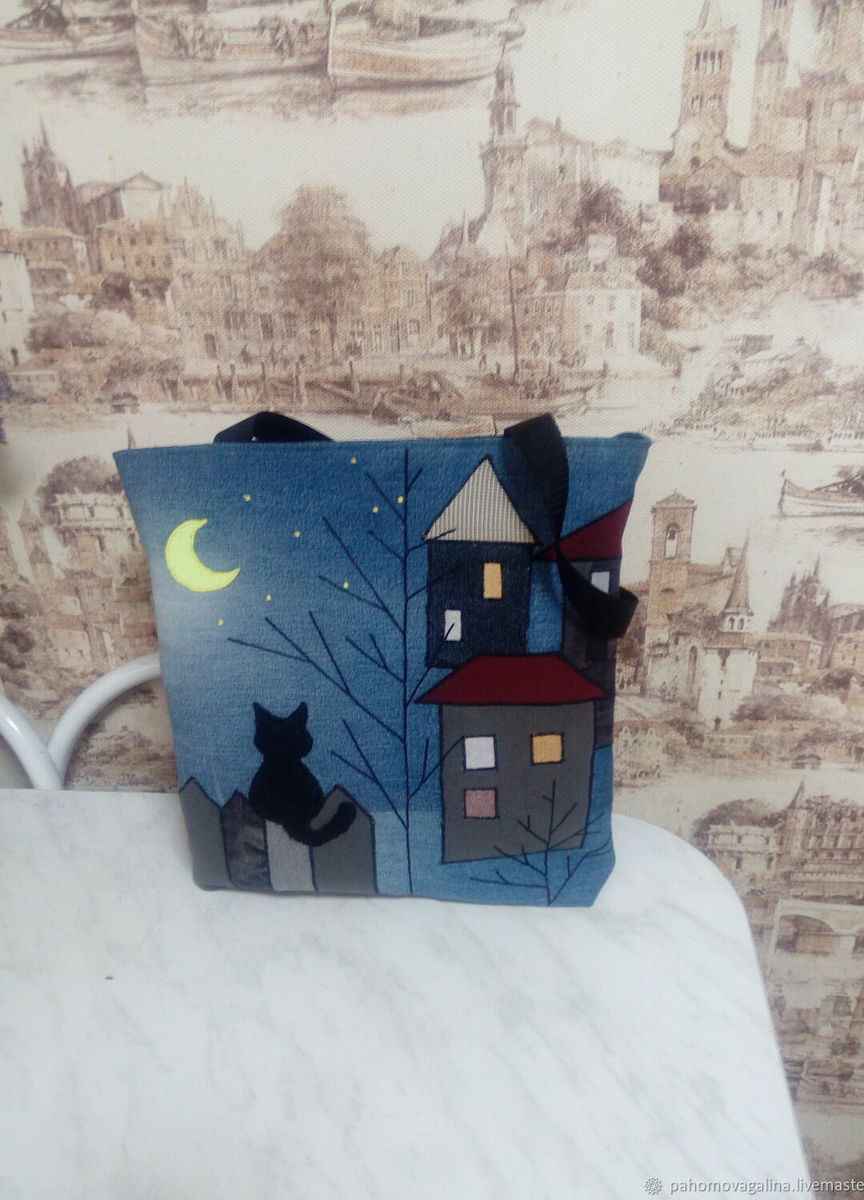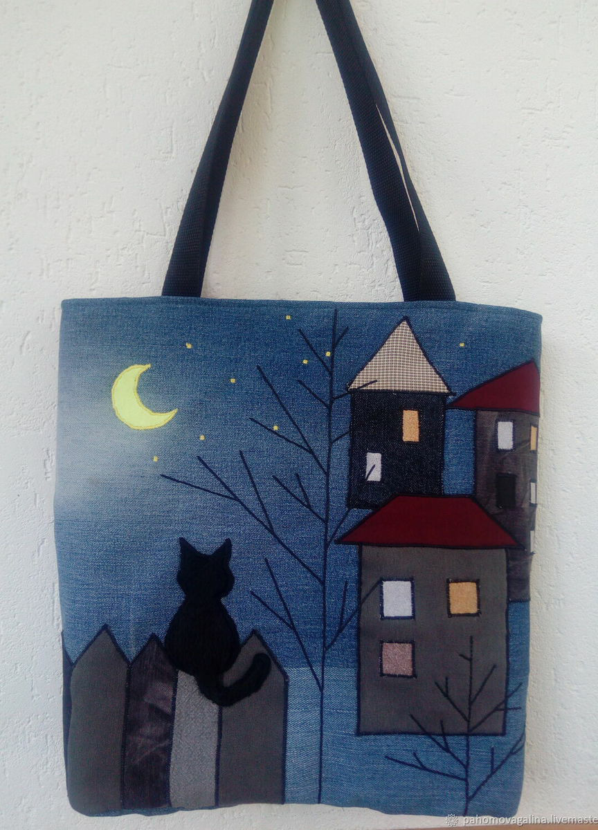 Джинсовая сумка—шопер с подкладом и замком молния. Интересная аппликация не оставит вашу сумку без внимания окружающих!Есть два внутренних кармана, один на молнии.Ручки прочные и достаточно длинные, можно носит на плече.Отлично держит форму.
