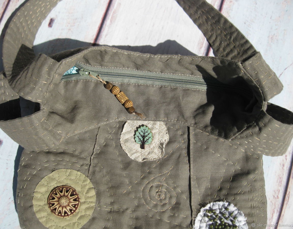 Льняная сумка в стиле "бохо".Оливкого цвета-фото,увы,не передаёт настоящий оттенок.Изготовлена с применением японской техники стёжки "боро" гарусом в фантазийном исполнении в сочетании со свободно-ходовой стёжкой.Украшена тканевыми элементами,простёганными в разных техниках и деревянным и пластиковым элементами,стразом под металл,деревянными бусинами и крупным бисером.