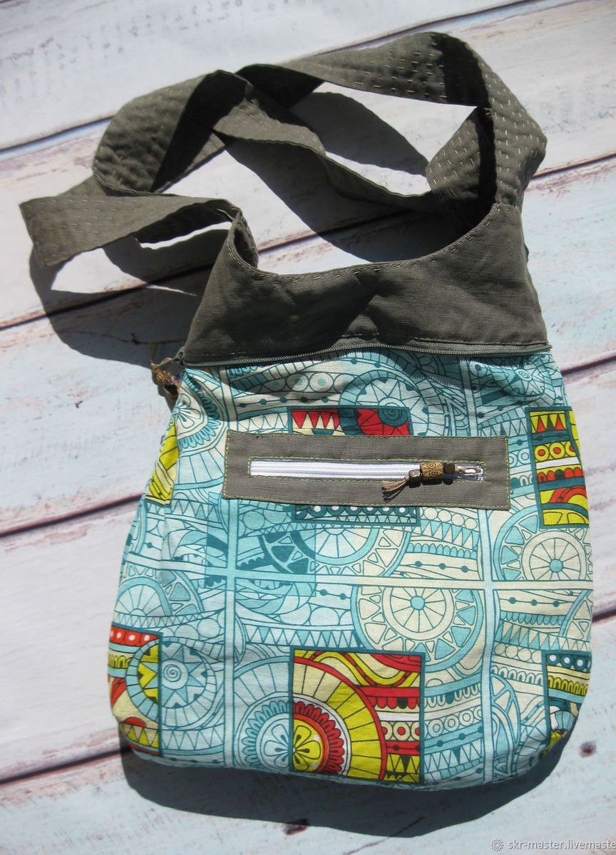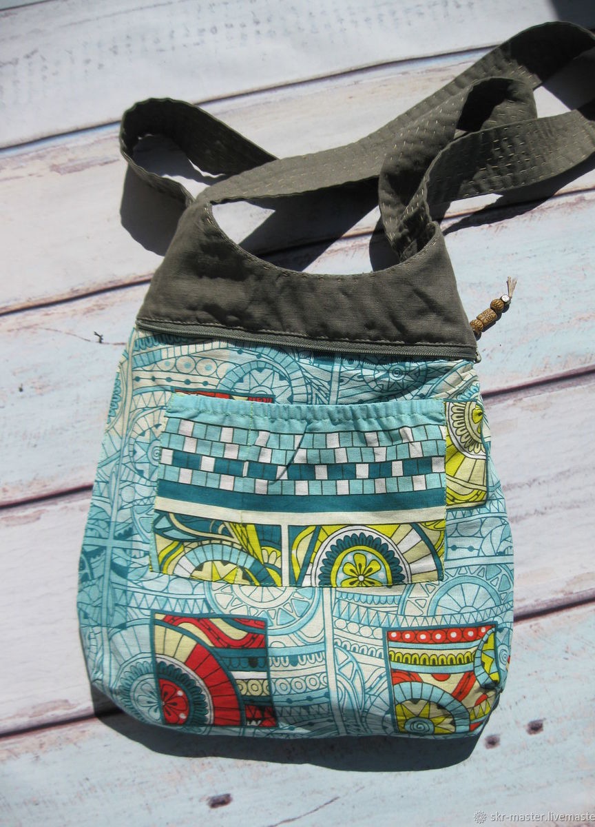 Сумка простёгана с уплотнителем.Застёжка на пластиковую молнию с декоративными элементами.Выполнена на подкладке из яркого, с абстрактным рисунком ,хлопка.Внутри 3 кармана-2 открытых с резинкой для фиксации верхнего края и 1 на молнии с красивыми бусинами..На задней стенке,простёганной в свободно-ходовой технике,в рамке-карман на молнии.Ручки проклеены и простёганы гарусом.