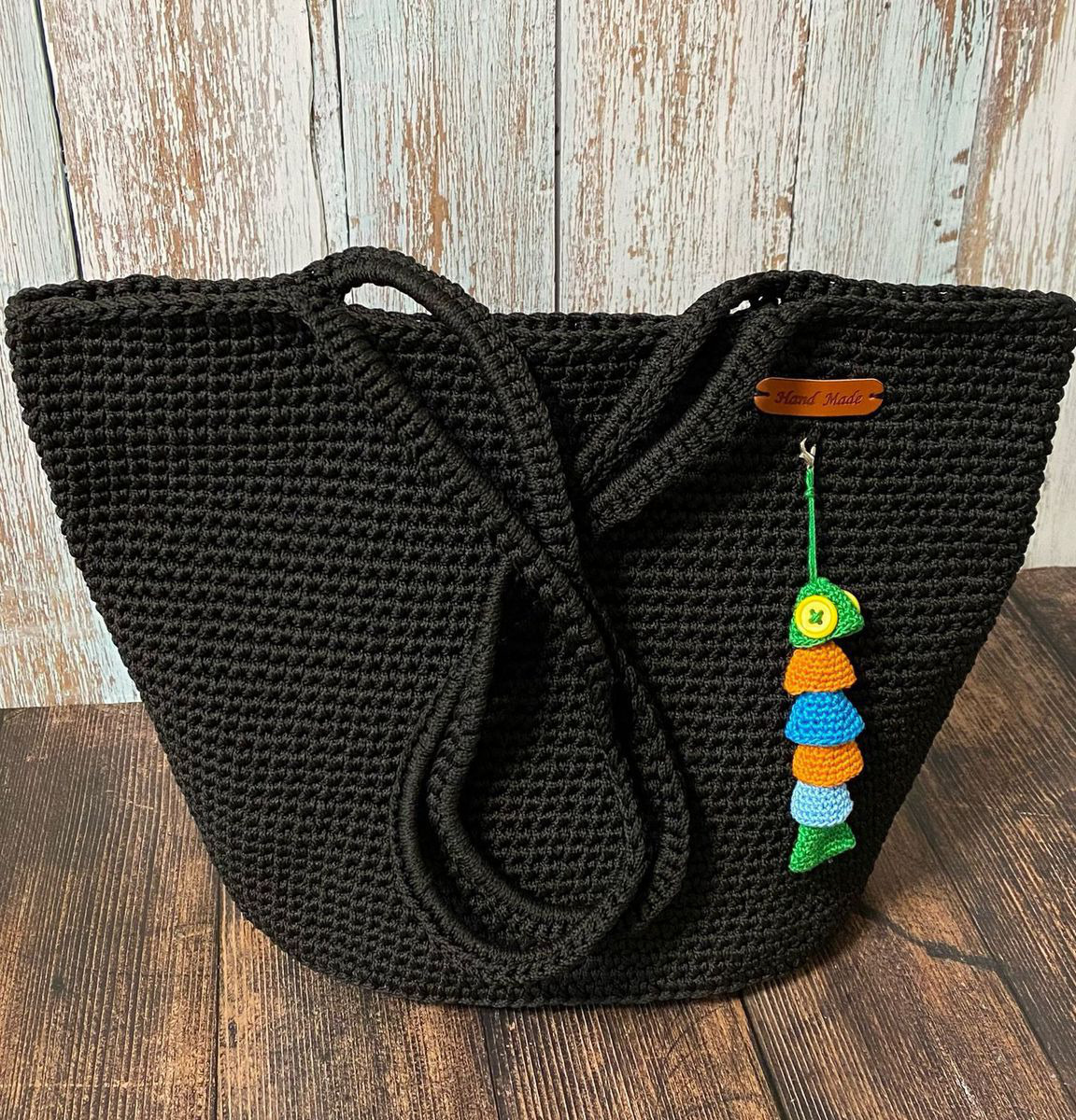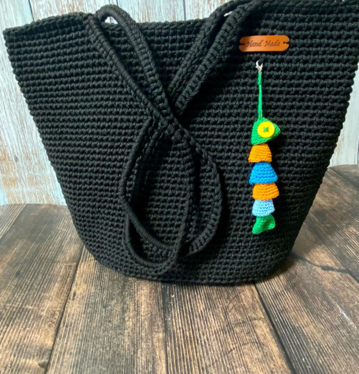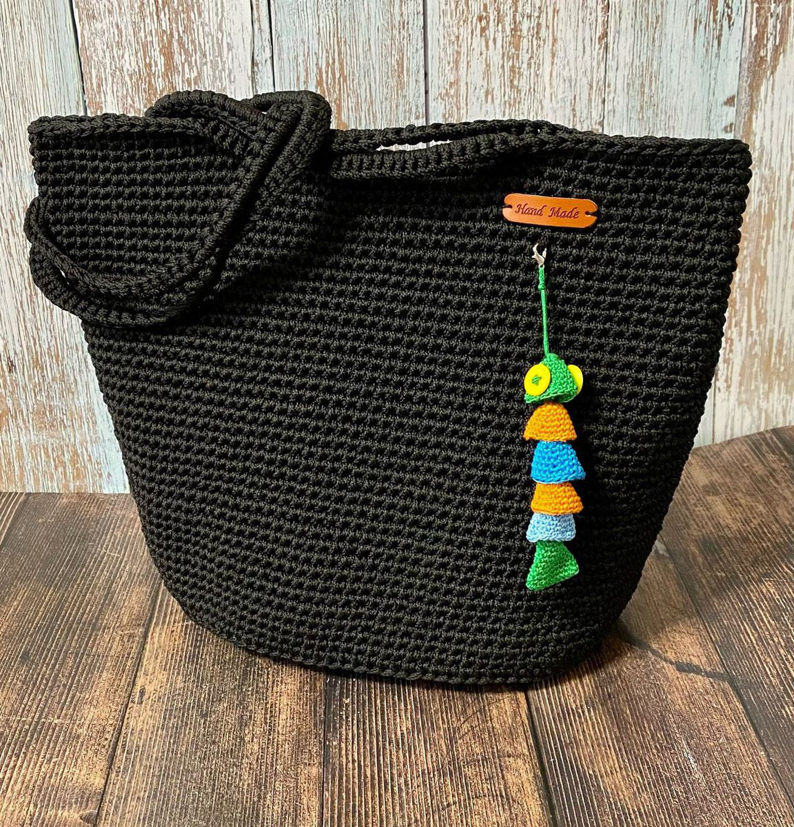 Сумка связана из полиэфирного шнура. Сумка хорошо держит форму и подходит на каждый день. Размеры: высота 27-28 см, ширина 34 см . Дно 17*24 см