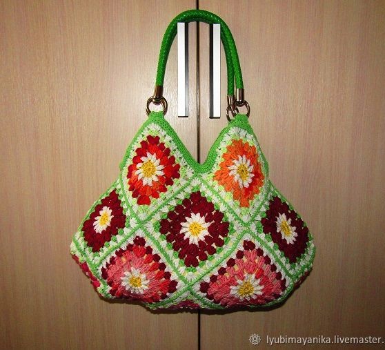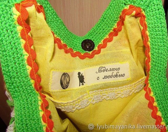 Сумка связана из отдельных мотивов.Пряжа 100 % хлопок.Не вытягивается.Идеально держит форму за счет внутреннего подклада .Внутри сумки есть два кармана.