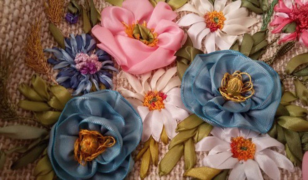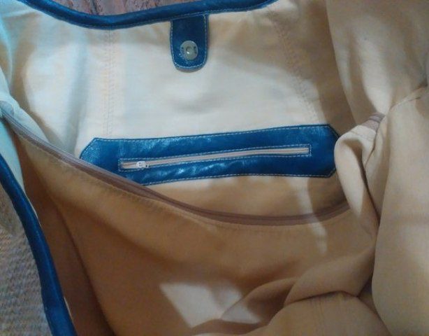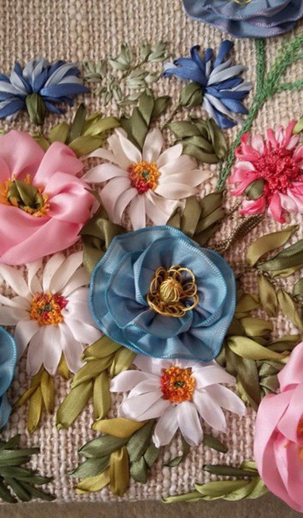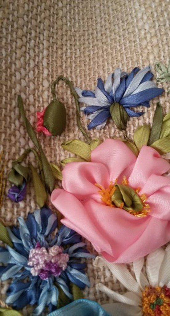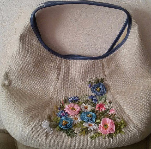 Сумка сшита из ткани для сумок, отделка синей кожей, вышита лентами из искусственного шелка,на подкладке.Сумка держит форму, так как ткань продублирована. Внутри 2 кармана. Размер ручки позволяет носить ее на плече.