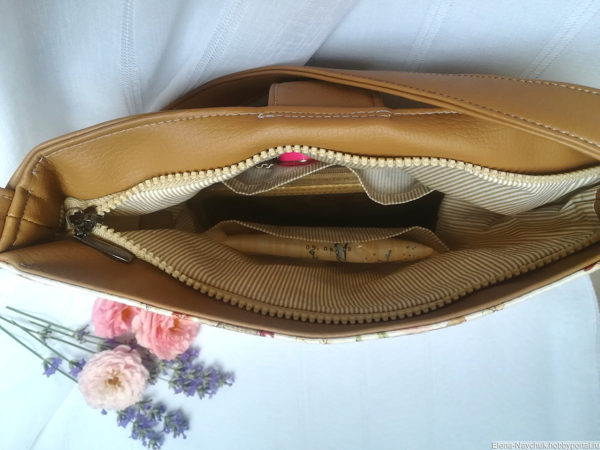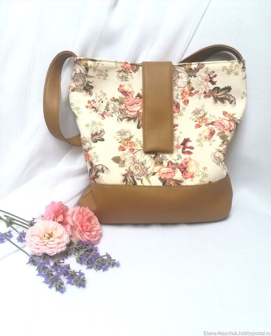 Пошита сумка из прочной эко-кожи. Передняя стенка украшена джинсовой тканью с нежным цветочным принтом.