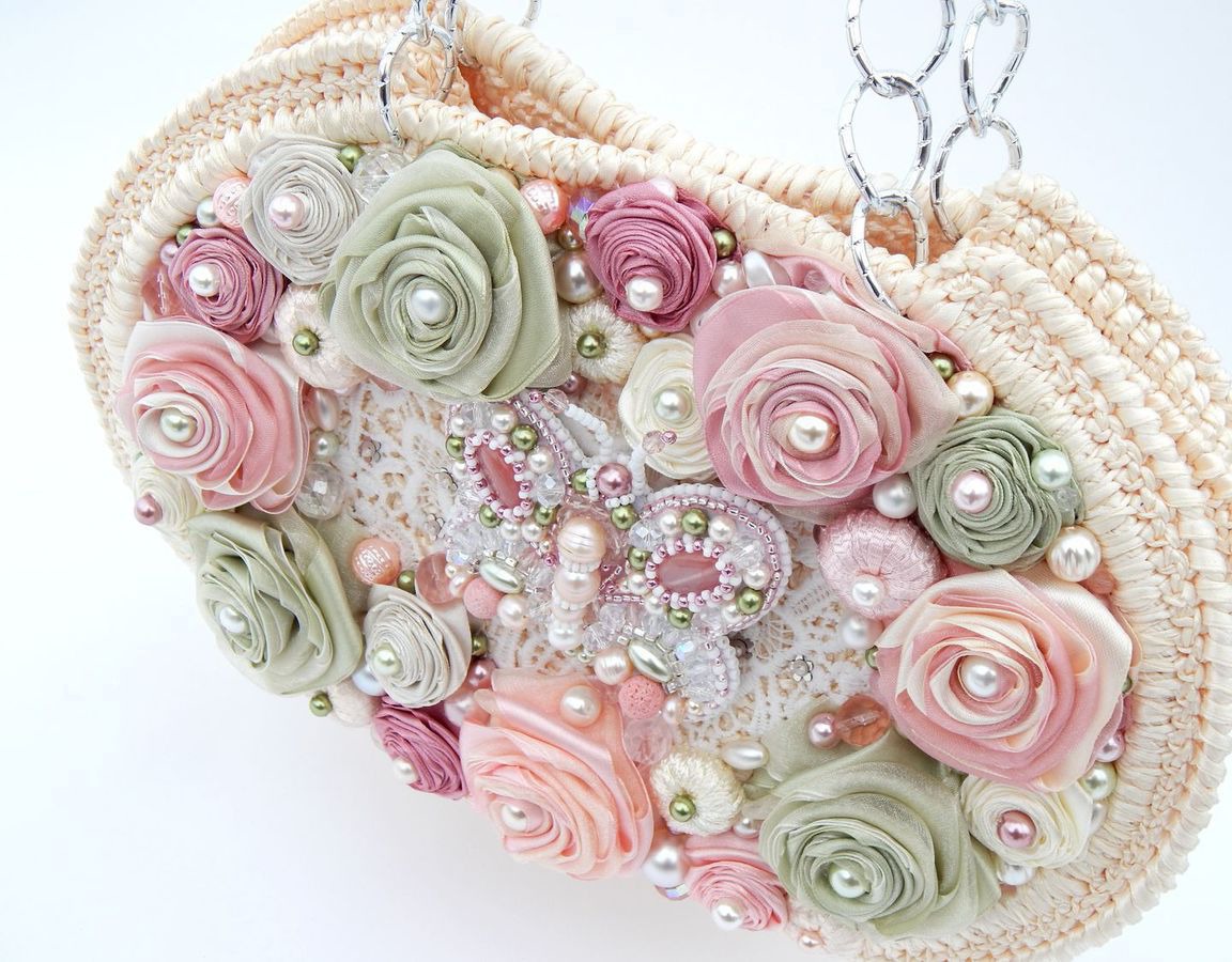 Сумочка связана крючком из атласных лент. Декорирована розами из атласных и органзовых лент, итальянским кружевным полотном, чешскими бусинами под жемчуг, стеклянными бусинами, итальянским пайетками. Бабочка-брошь вышита с использованием натурального жемчуга, жемчуга Сваровски, Presiosa, бусин коралла, чешского хрусталя и стекла, турмалина, японского бисера Тохо. Брошь можно носить отдельно.