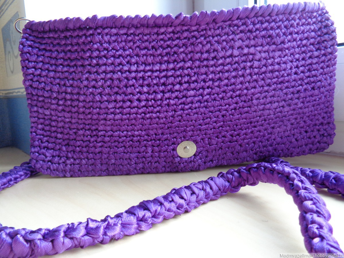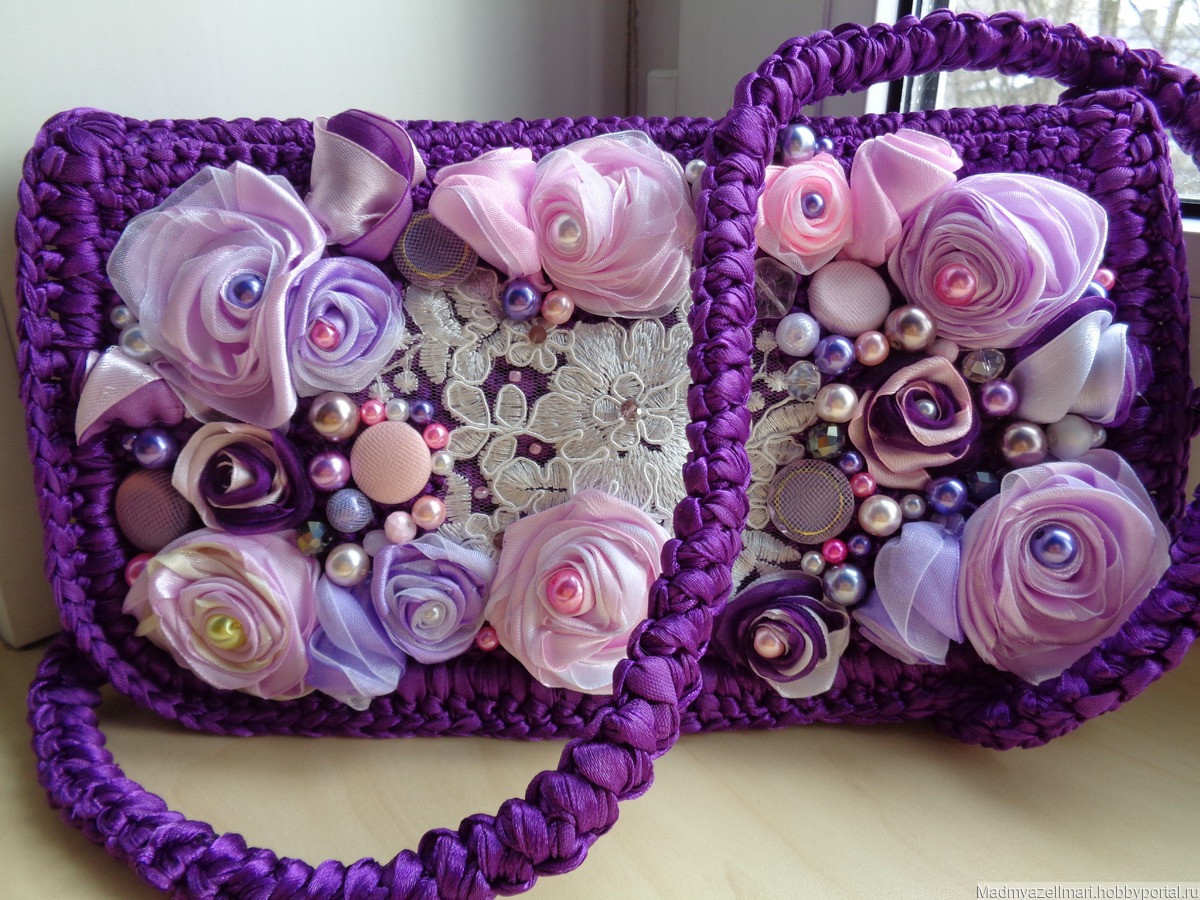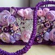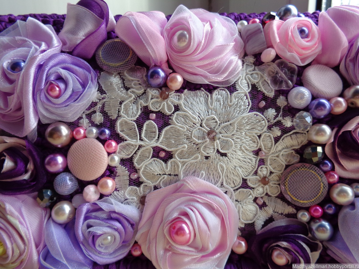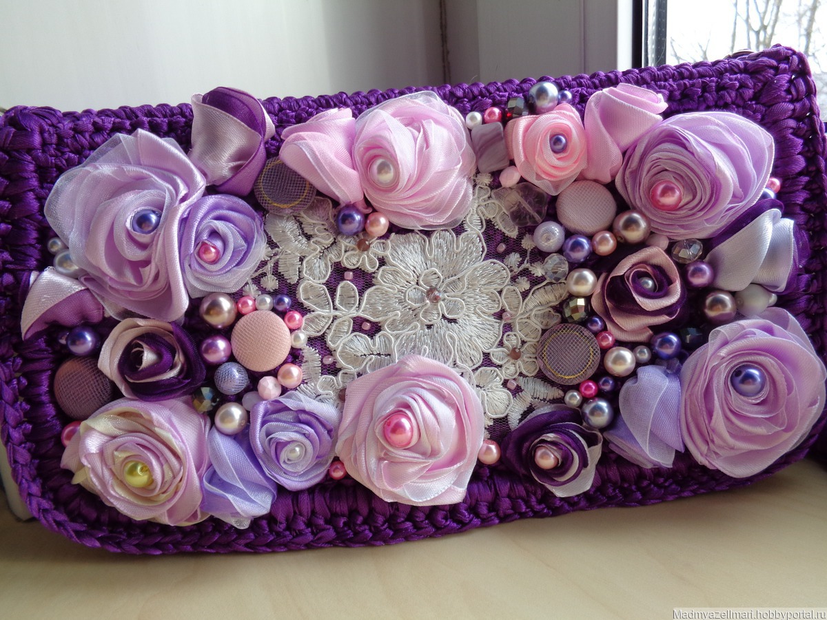 Женская сумочка - клатч "Сиреневый туман" связана и декорирована атласными лентами, жемчугом и кристаллами "Сваровски", итальянским кружевом. Размер сумочки 27 х 15 см. Застежка - кнопка, ручка связана из атласных лент .