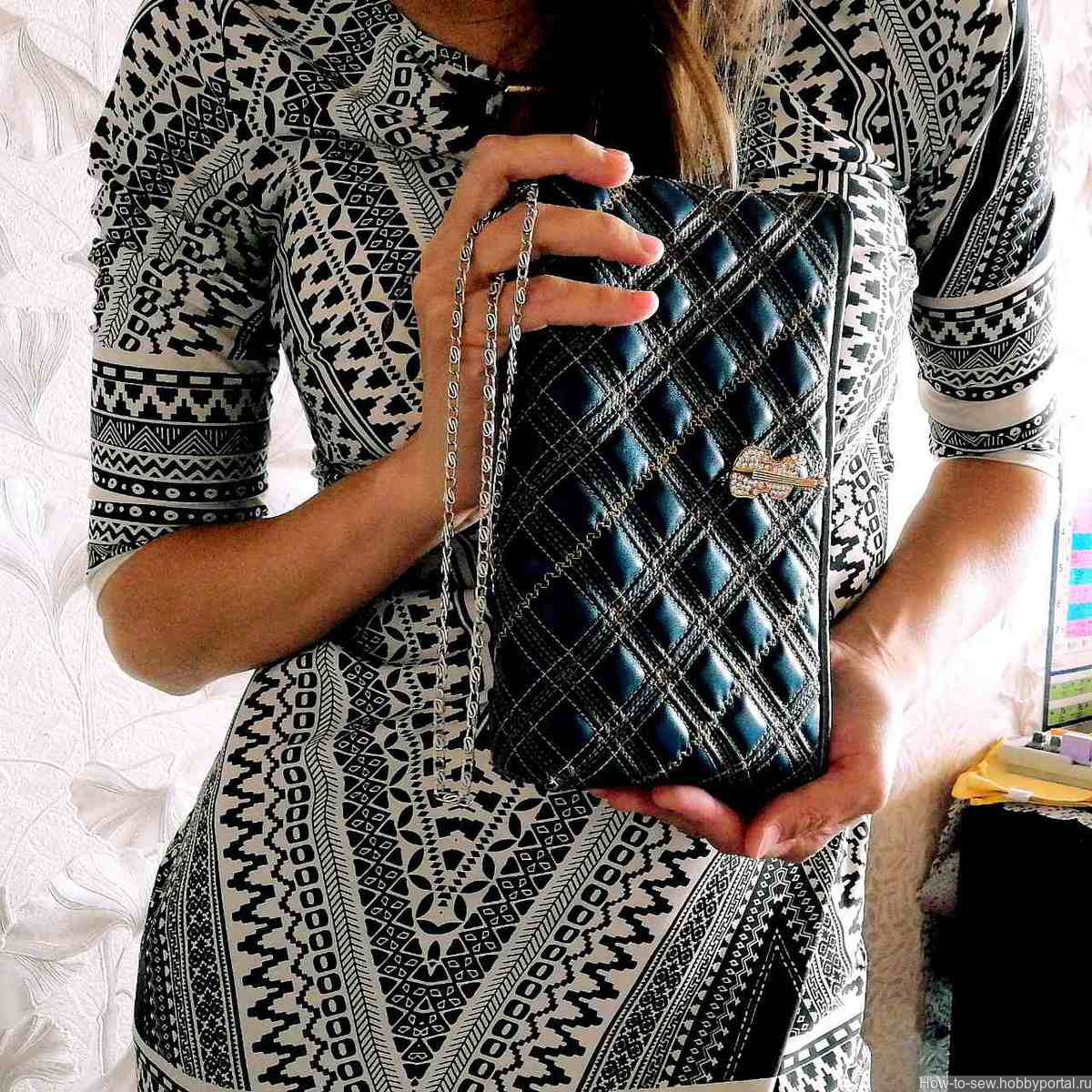 Сумочка простегана, и кожаные выпуклые квадратики приятны на ощупь)) Внутри тканевая подкладка с двумя объемными кармашками. Закрывается на молнию. Цепочка на карабинах, отстегивается.