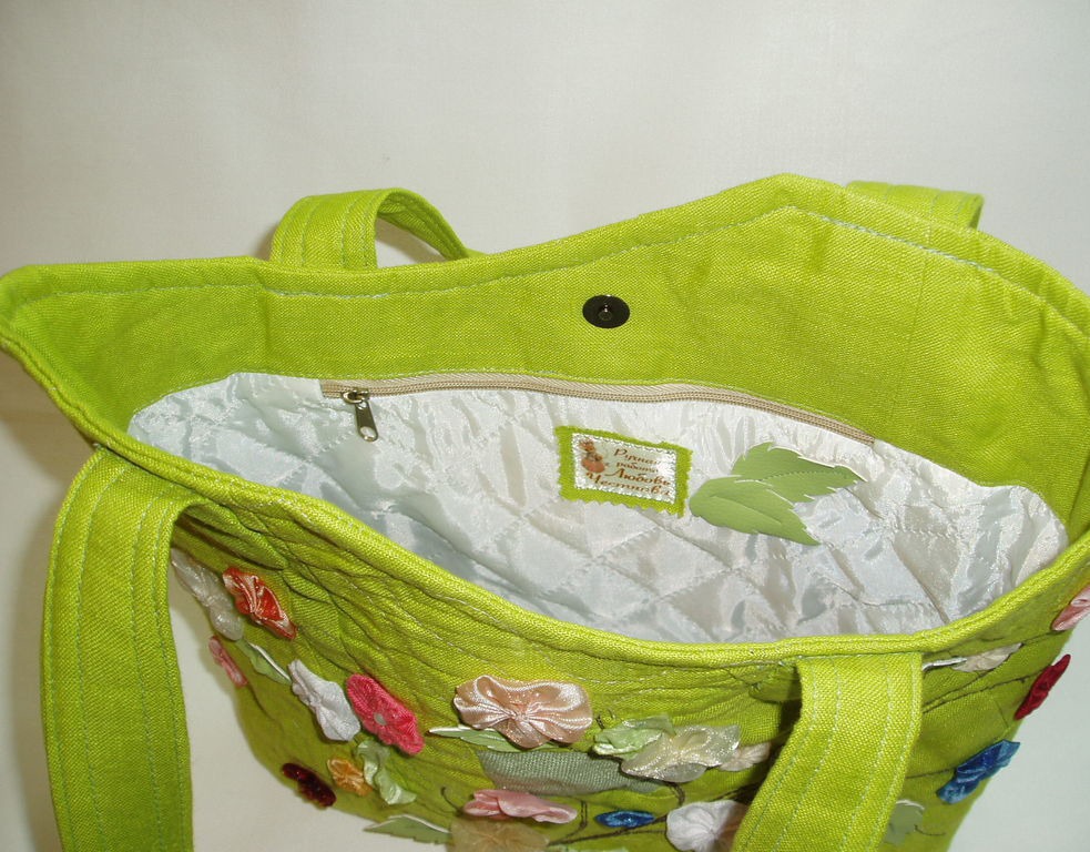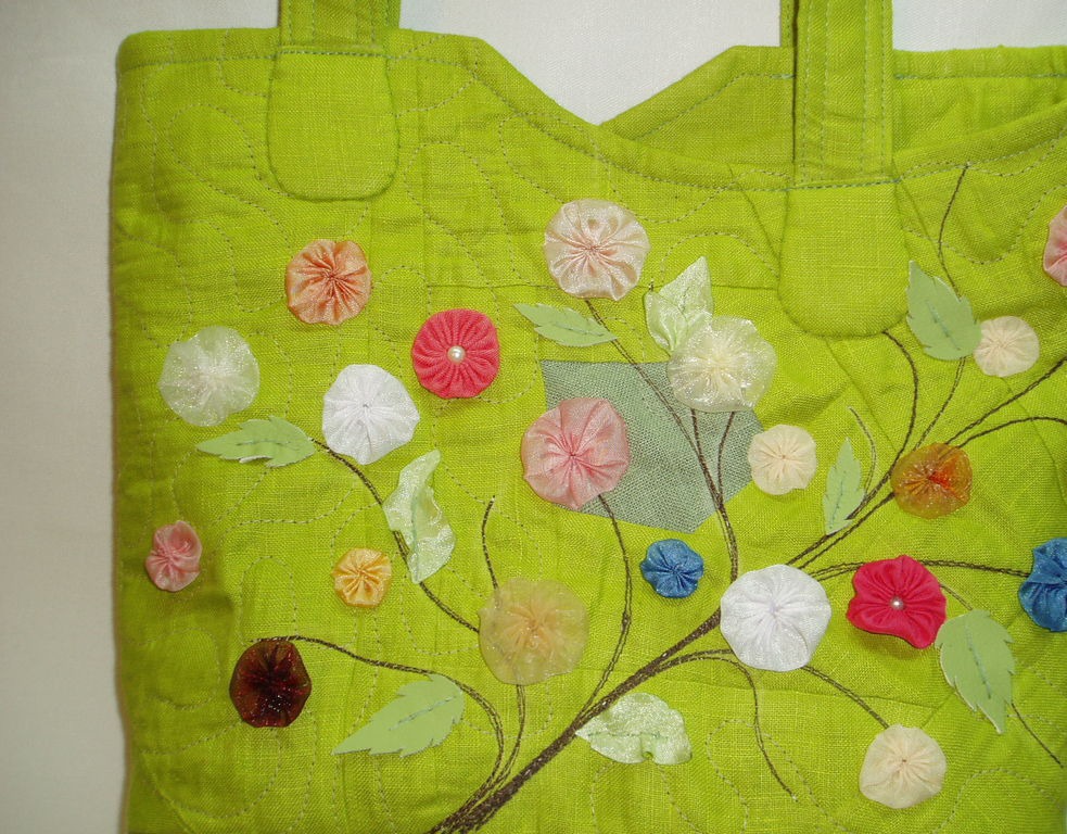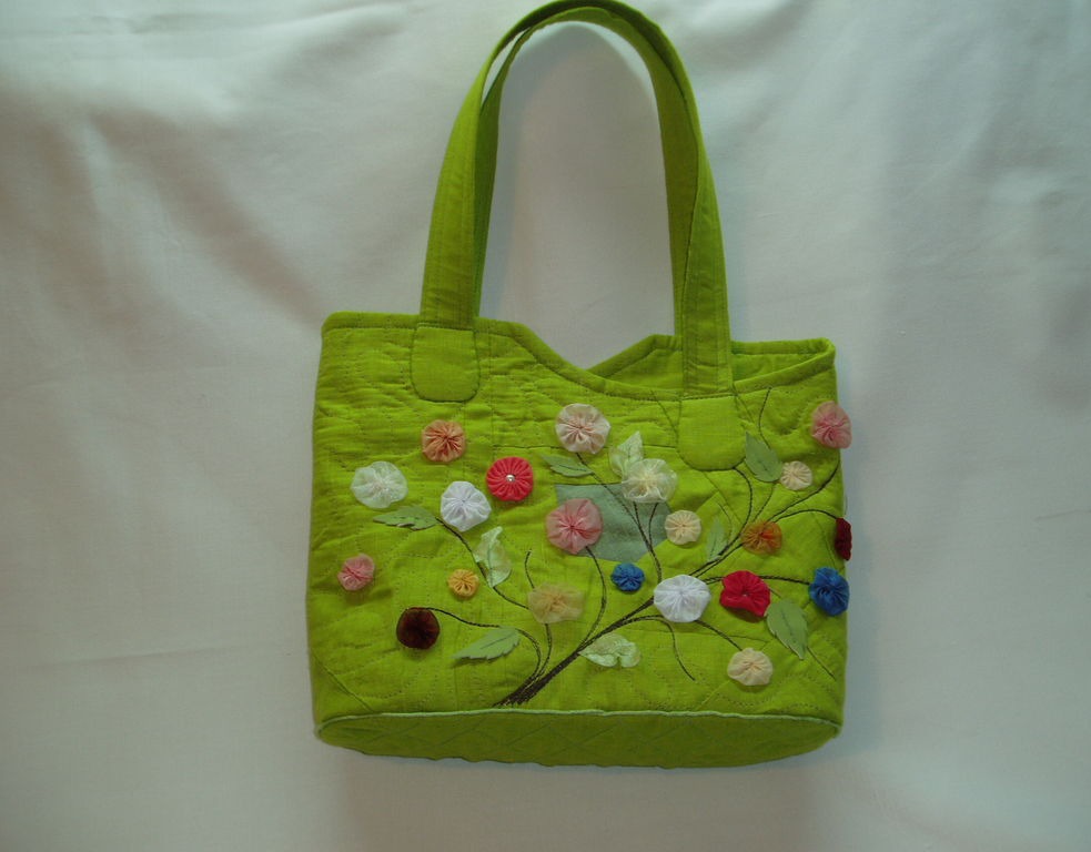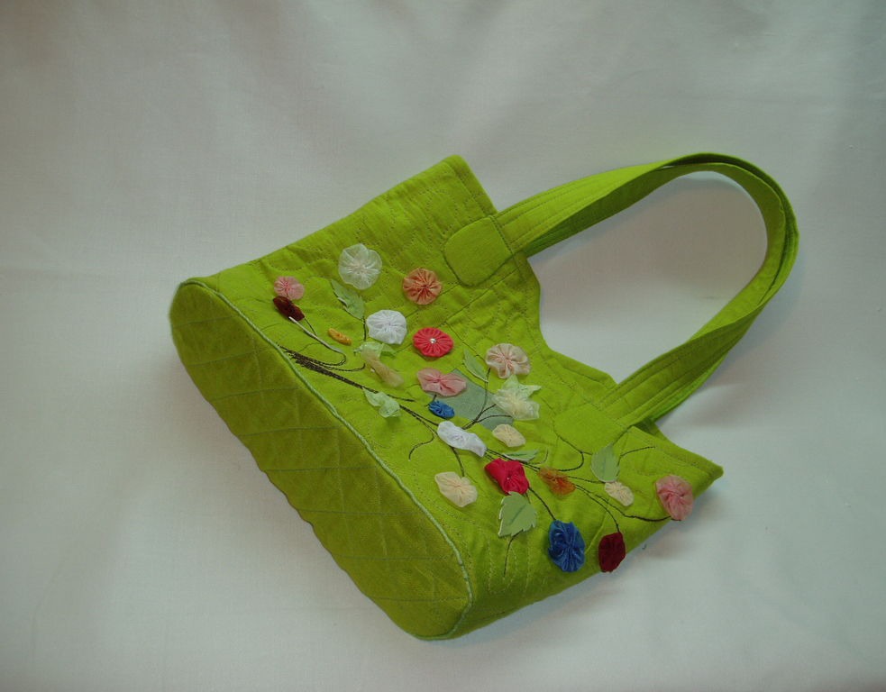 Яркая сумочка будет ярким аксессуаром в вашем гардеробе. Сшита изо льна на стеганой подкладке, со внутренним карманом на молнии, застежка- магнит. Декорирована машинной вышивкой и цветочками "йо-йо".