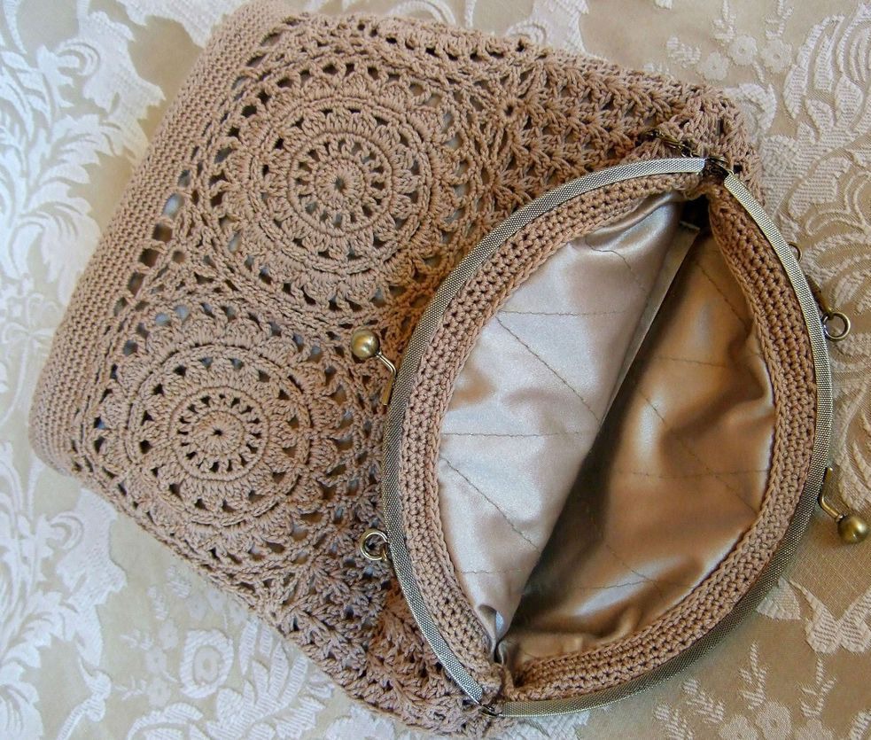 Сумочка связана из 100% мерсеризованного хлопка, на двойном подкладе, отлично держит форму, закрывается на элегантный рамочный замок – фермуар, дно жесткое. Внутри сумочки два небольших открытых кармана для телефона и мелочей.