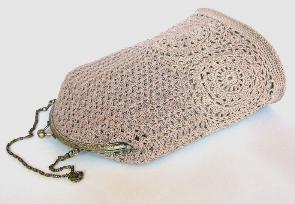 Небольшая вязаная сумочка пепельно- бежевого цвета на фермуаре.