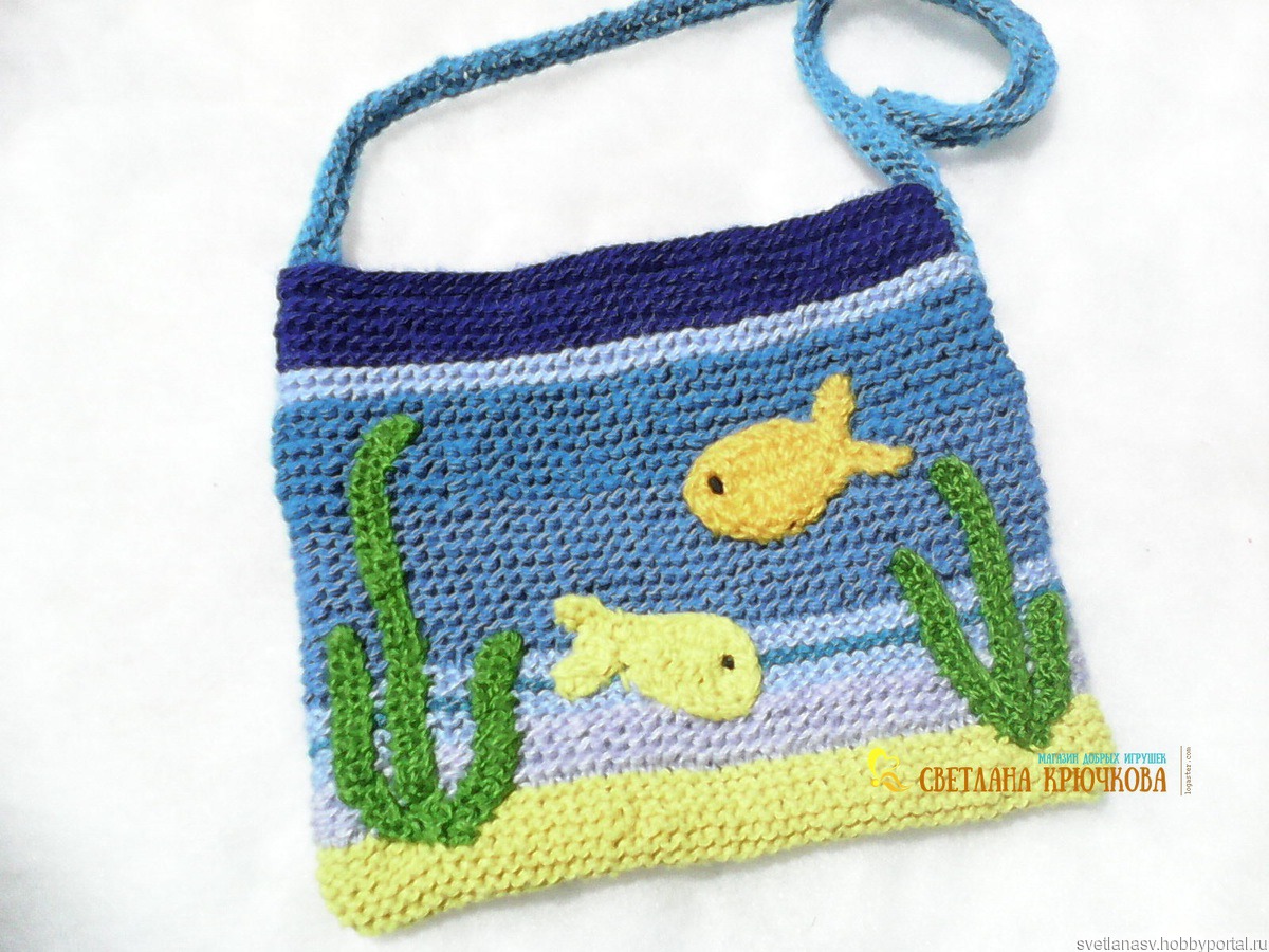 Вязаная сумочка для девочки любого возраста. В сумочке выполнена подкладка, застегивается на липучку. На передней стороне выполнена аппликация в виде плавающих в аквариуме рыбок. Замечательно дополнит любой наряд.