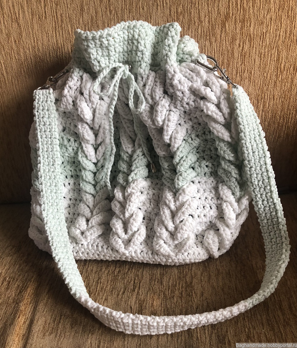 Вязаная сумка-торба с плечевым ремнем на подкладке, с утяжкой. Сочетание двух цветов: белого и нежно-салатового.