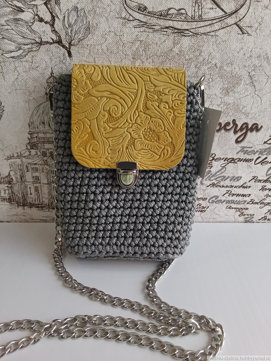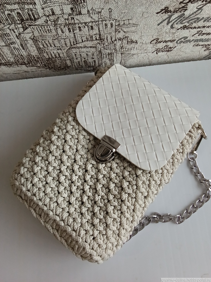 Сумочки связаны из шнура полиэфирного, фурнитура серой-натуральная кожа, у сумочки цвета льна фурнитура эко кожа. Цепь металлическая, длиной 120см. Цена за 1 шт.