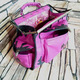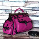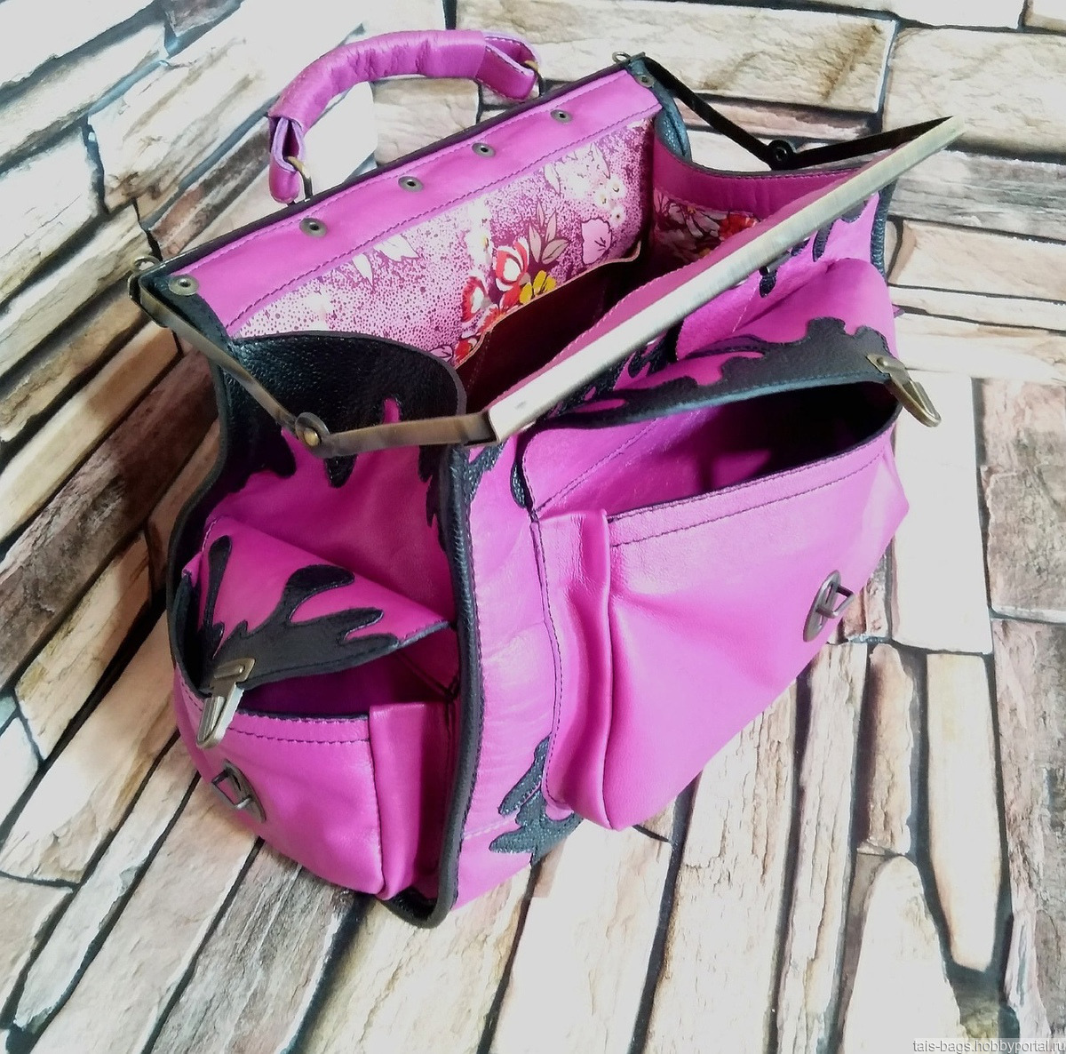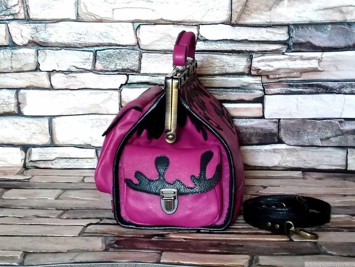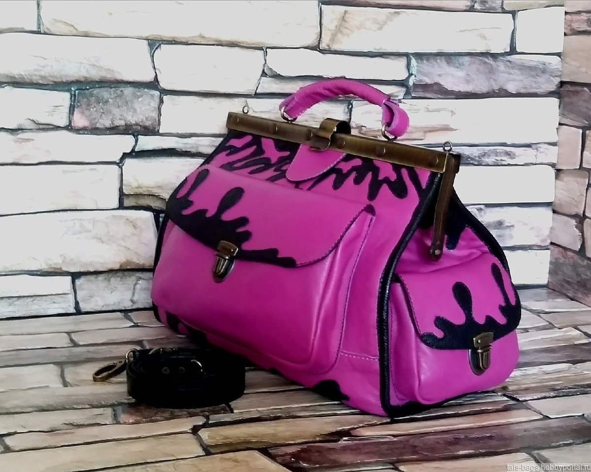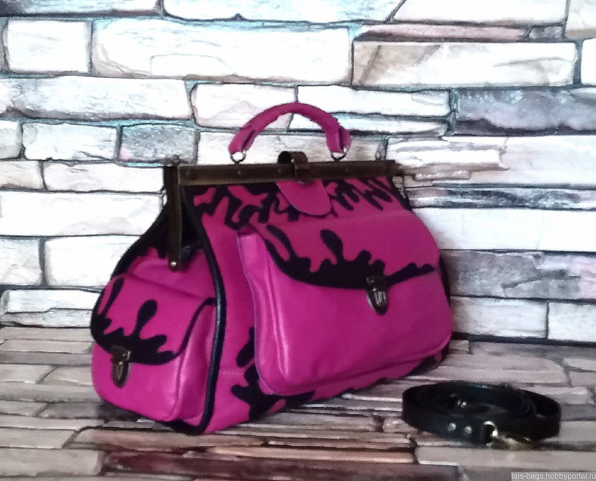 Саквояж ФЛАМЕНКО выполнен из натуральной кожи кавиар черного цвета ,гладкой кожи цвета фуксии и металлической фурнитуры бронзового цвета.
