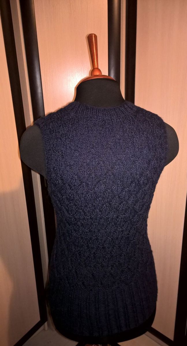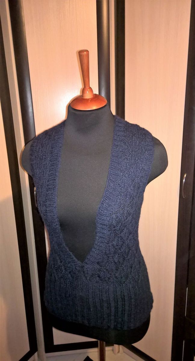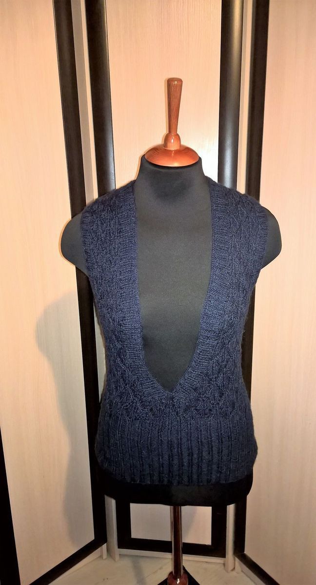 Ажурный жилет выполнен из мягкой пряжи темно синего цвета. Выглядит стильно. Изделие мягкое, на ощупь приятное.