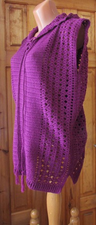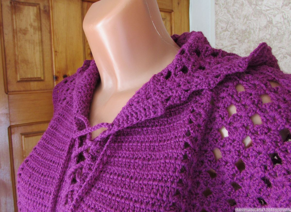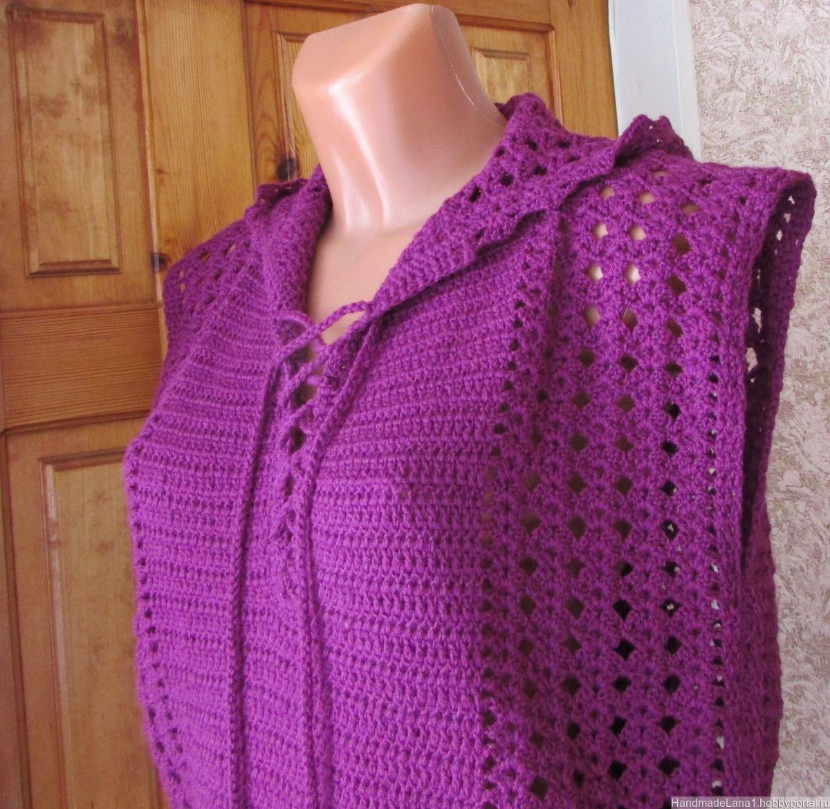 безрукавка вязаная, безрукавка женская, безрукавка крючком, безрукавка теплая, безрукавка с капюшоном, купить безрукавку, фиолетовая безрукавка