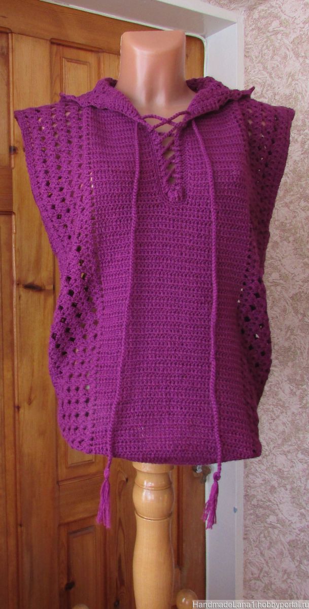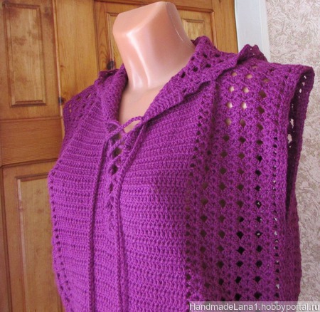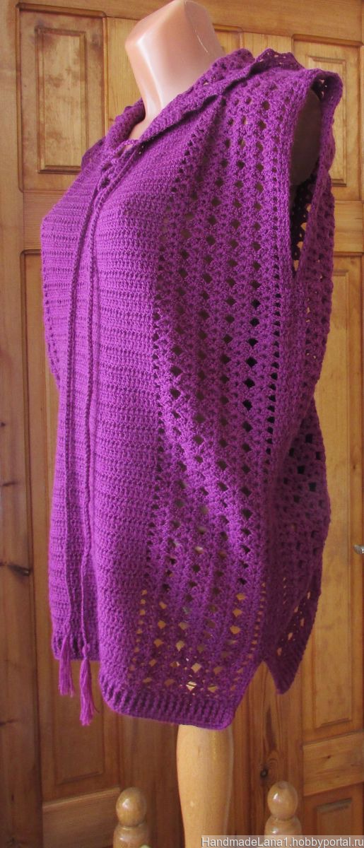 Безрукавка с ажурным капюшоном - изделие ручной работы, вязание крючком,