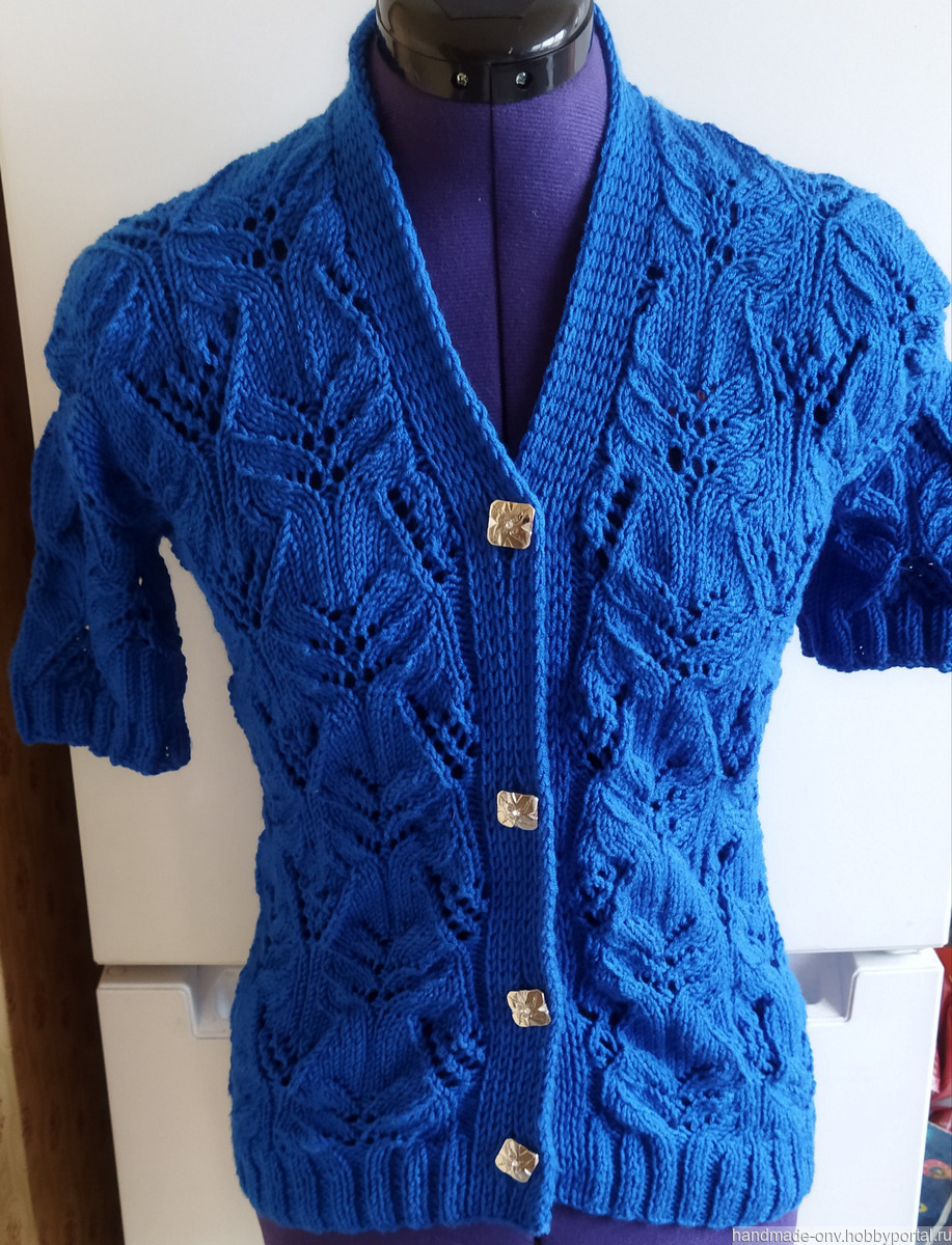 Ажурный, укороченный кардиган с V - образным вырезом, с коротким рукавом, на пуговицах.