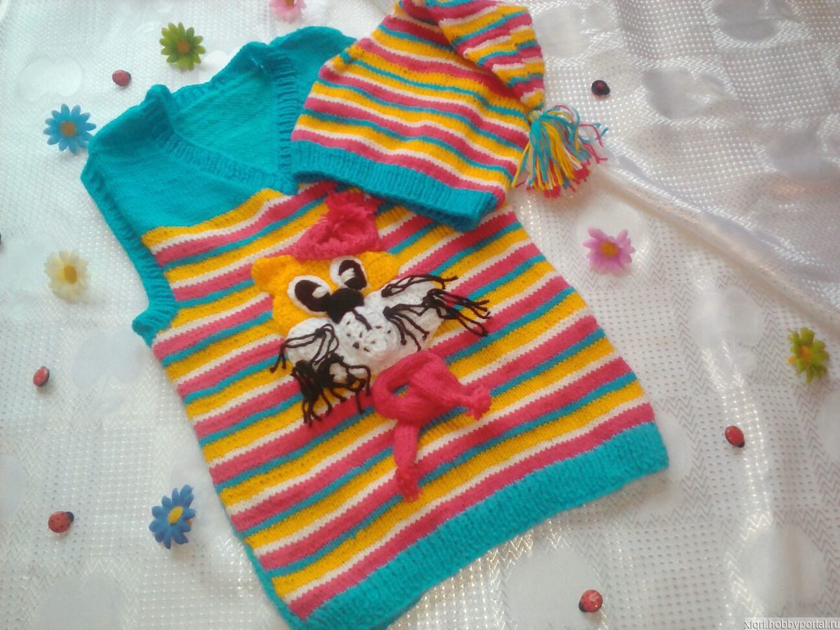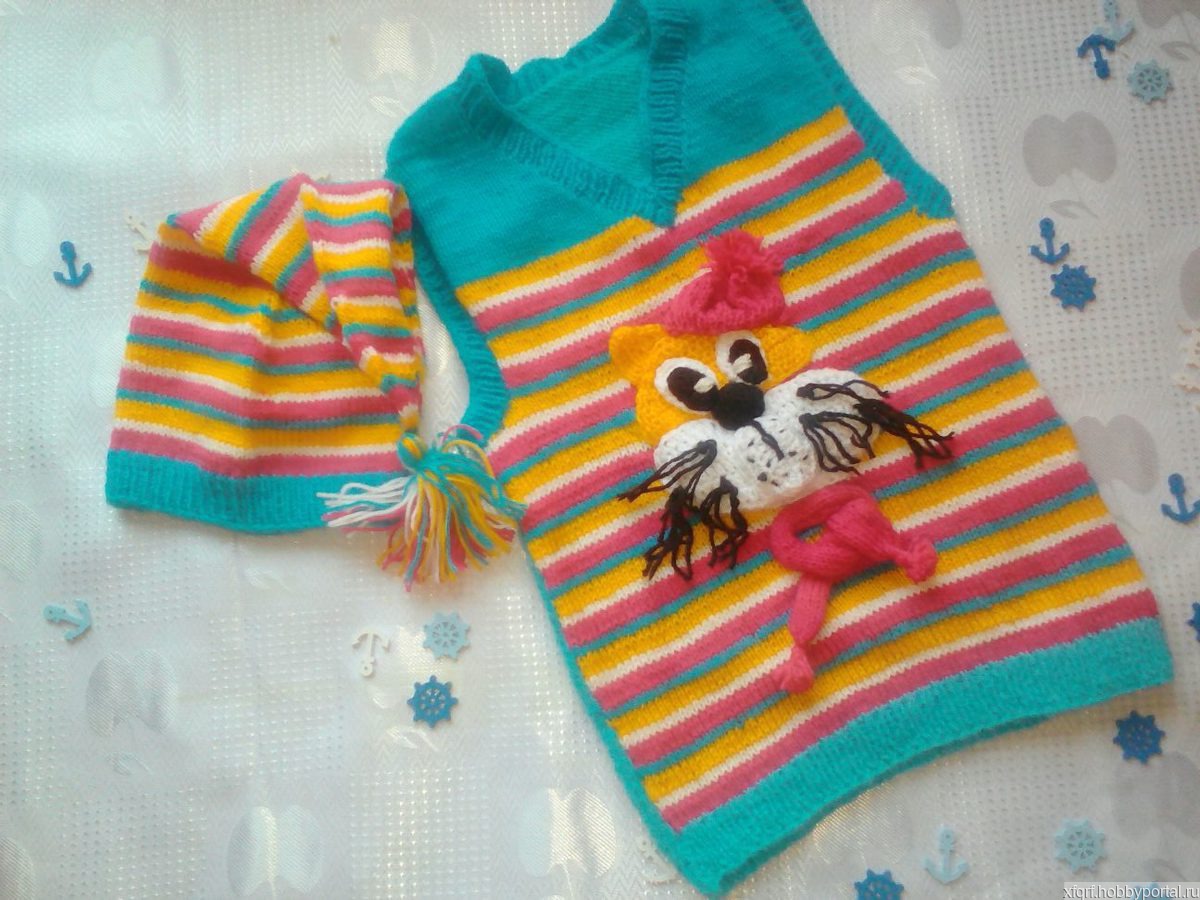 набор состоит из жилета с аппликацией и шапочки -колпачок выполнен спицами при необходимости повторю в любом цвете и нужный размер возможны другие варианты аппликаций