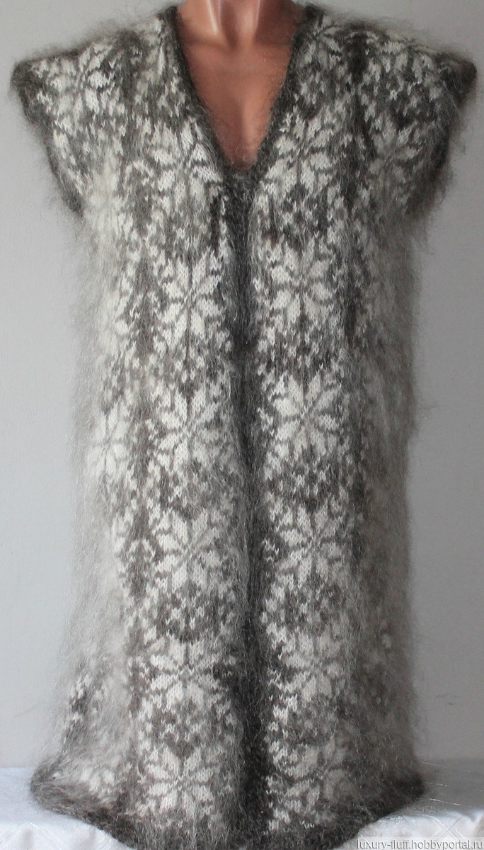 Среди многочисленных типов женской одежды всегда найдутся вещи, которые подходят абсолютно всем. Например, женские кардиганы, они сочетают в себе элегантность классического стиля, изысканность романтического, а ещё они могут стать прекрасной альтернативой пиджака в холодное время года.Удлиненный пуховый кардиган связан нежного пуха . Очень приятный, уютный и теплый!! Можно носить как дома, так и на работе. Жилет такой длины удлинит силуэт и поможет сохранить женское здоровье в холодное время года. Спущенное плечо. Ровная жаккардовая вязка. Интересный орнамент вывязан как на полочках, так и на спинке. Длинный козий пух. Такой жилет можно носить как с брюками, так и с юбкой. Можно составить комплект из платья и жилета. Интересный кожаный или любой другой пояс подчеркнёт вашу фигуру и Вы всегда будете выглядеть привлекательно и соблазнительно. Длина жилета - 100 см. Размер 52-54.
