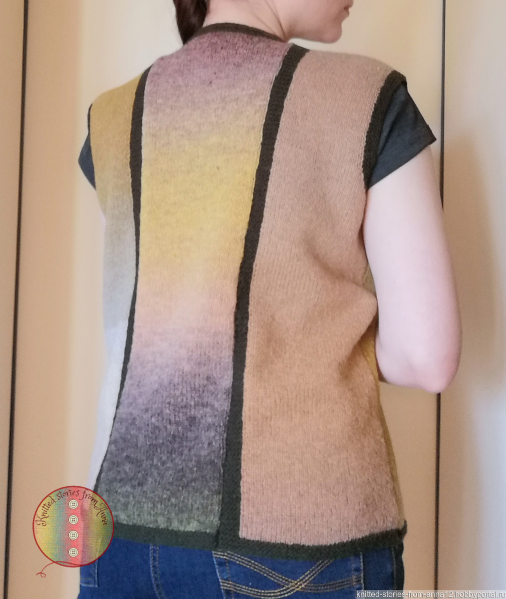 Вещи из тончайшей шерсти (дундаги) всегда отличаются непредсказуемостью и неповторимостью. Даже сам мастер не знает в точности, каким будет результат. Также было и с этим жилетом. Смешение разных фрагментов секционной пряжи и контрастная отделка вот секрет этого одновременно повседневного и нарядного жилета. Дундага очень легкая и теплая, поэтому жилет весит меньше 200 граммов. Когда в офисе еще нет отопления, жилет поможет вам согреться. Обратите внимание, что 100 % шерсть может немного колоться, поэтому жилет лучше всего надевать на блузку или водолазку из плотной ткани.