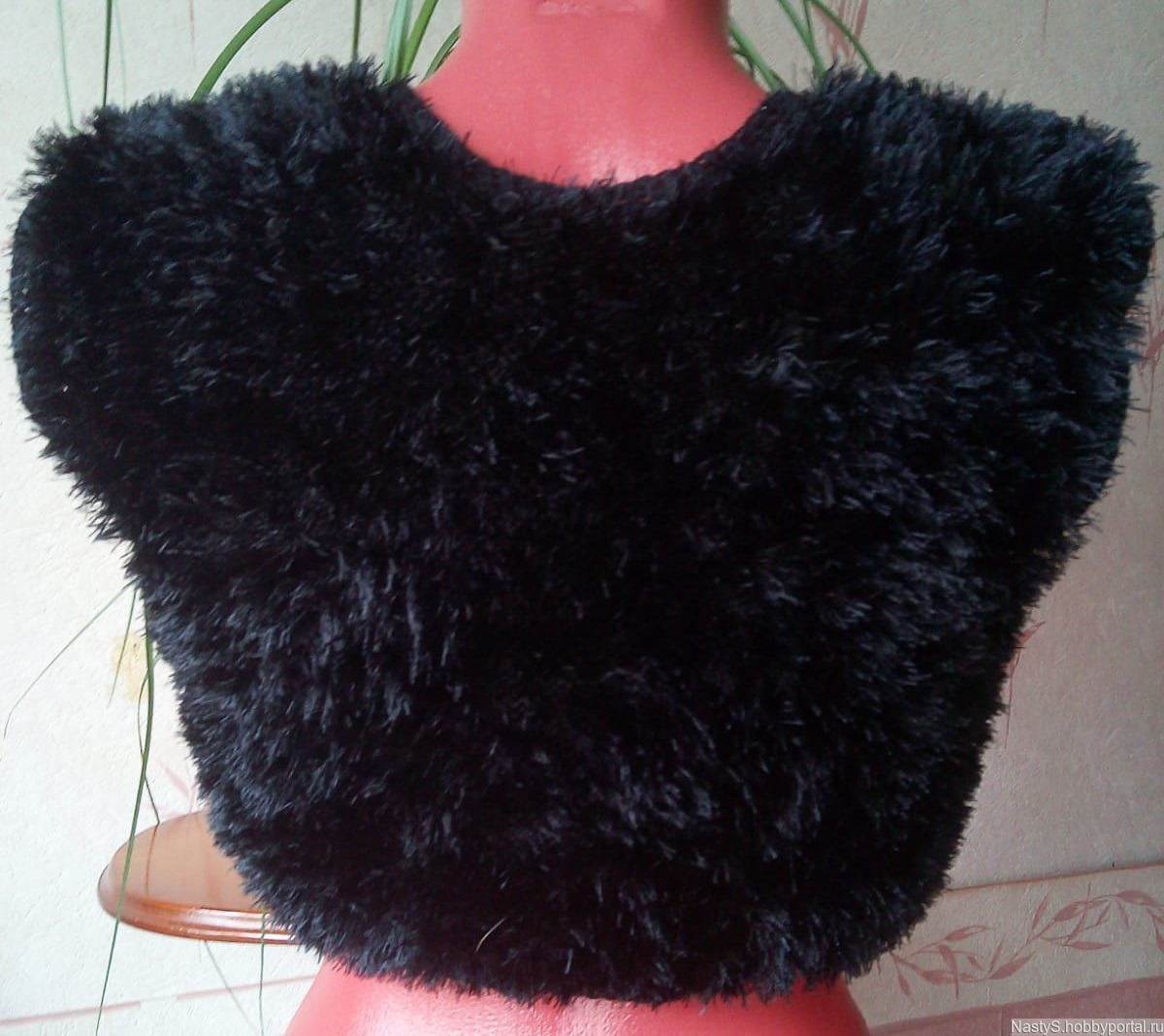 Маленькая женская жилетка укороченного силуэта связана из фасонной пряжи.