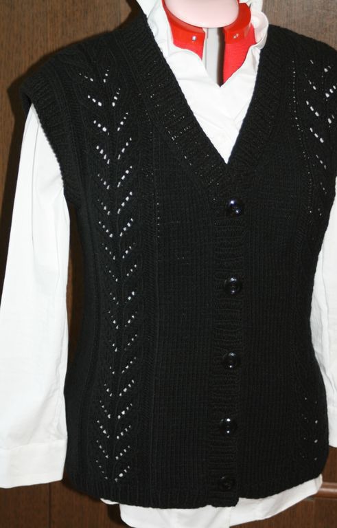 Классический жилет выполнен из толстой мягкой пряжи. Вертикальные ажурные полосы зрительно вытягивают силуэт и придают лбразу неповторимость. Цвет и ажур может быть изменен по желанию заказчика.