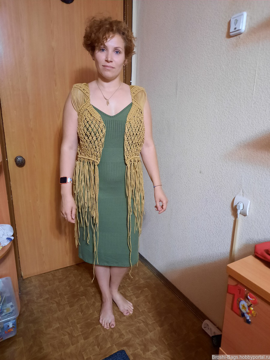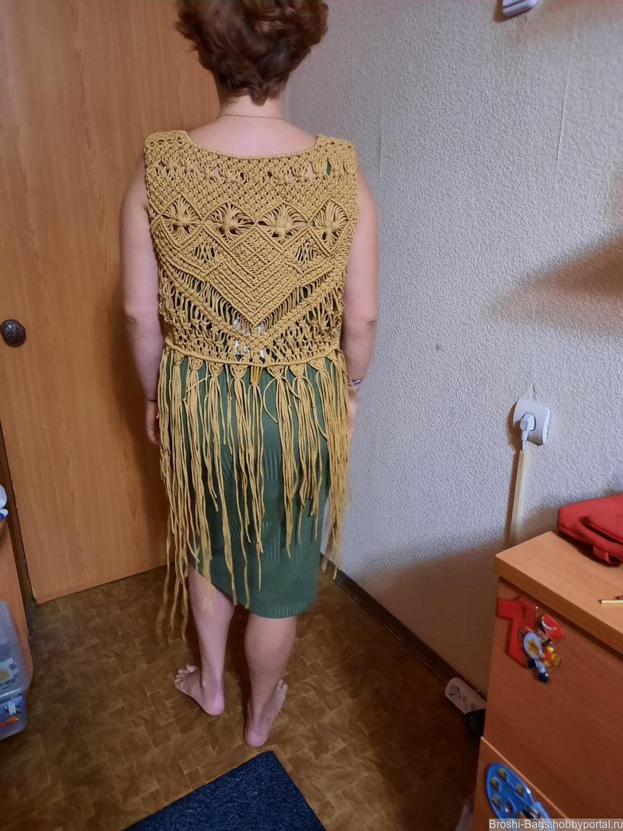 Жилет выполнен в технике макраме из полиэфирного шнура.