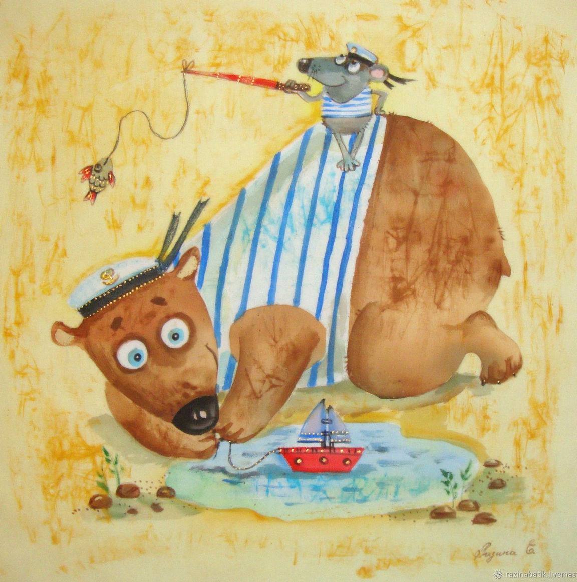 море, интерьер, корабль, медведь, панно, коричневый, картина, рыбак, багет, моряк, батик, рама, детсво, тельняжка