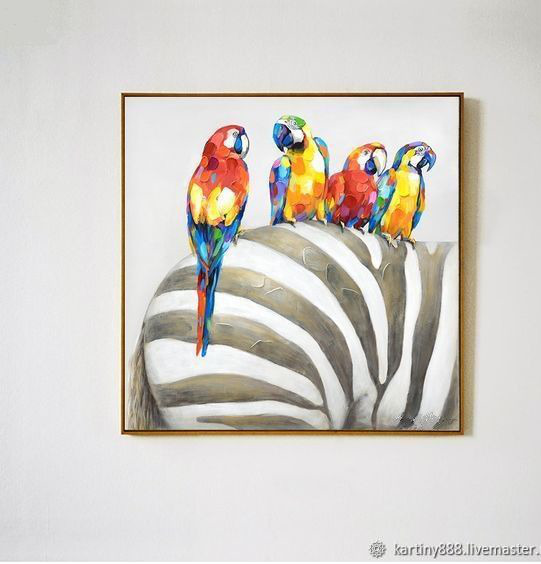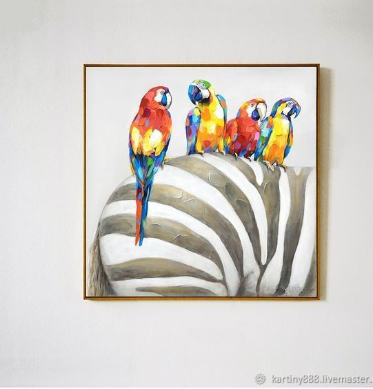 Картина Попугаи и зебра выполняется на заказ маслом или акрилом на холсте. Цена указана за размер 50х50см. Возможно выполнение в других размерах.