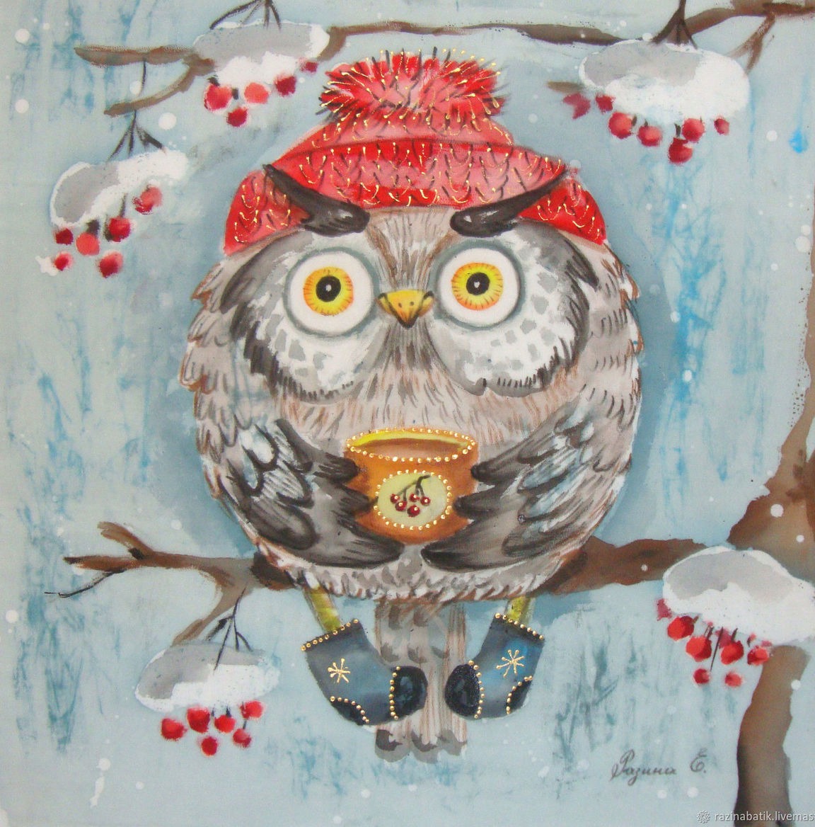 серый, Новый год, шапка, сова, панно, рябина, чай, зима, детство, снег, лес, валенки, батик, юмор, полярная сова