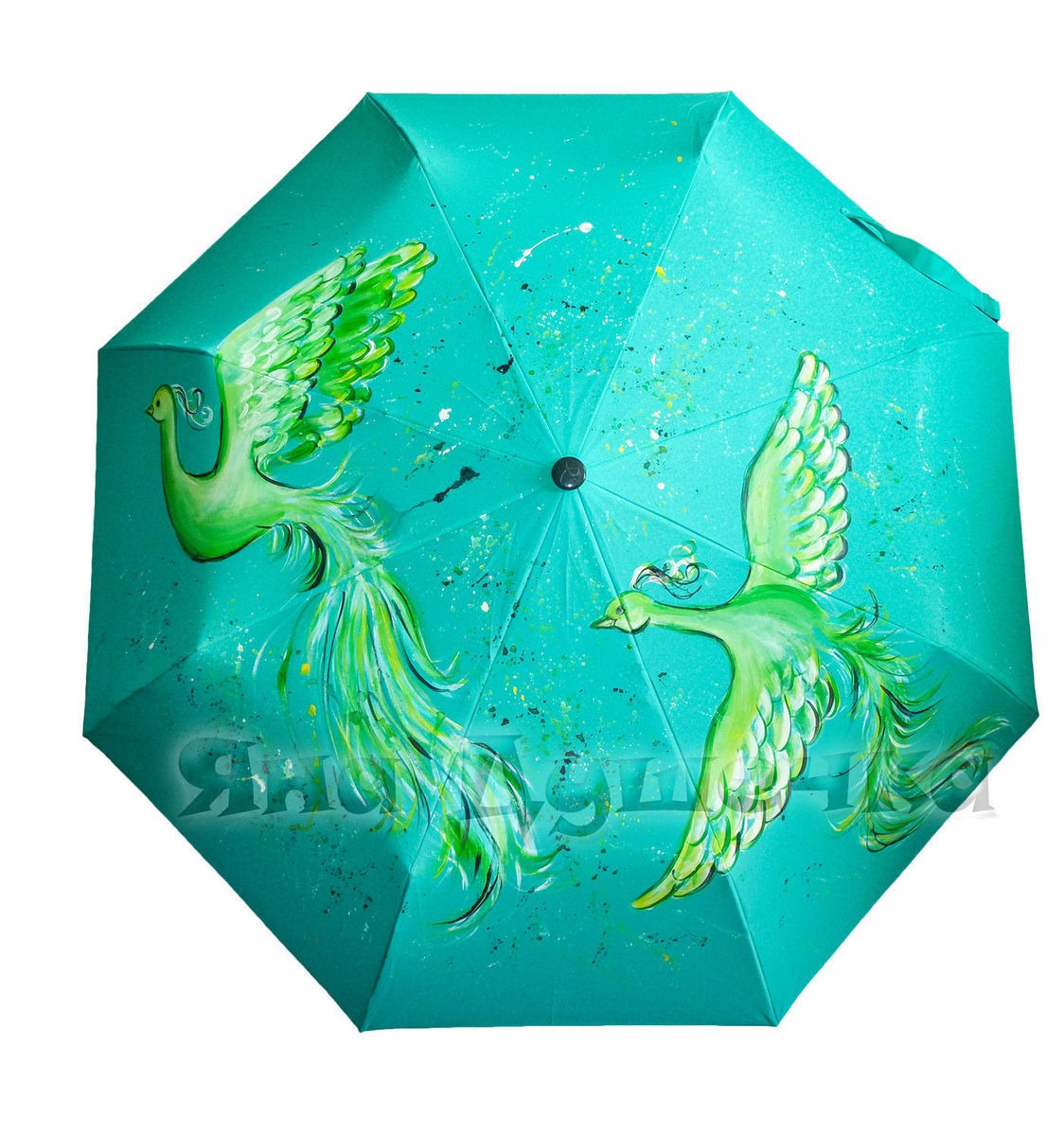 Зонт мятный с ручной росписью "Две жар-птицы"